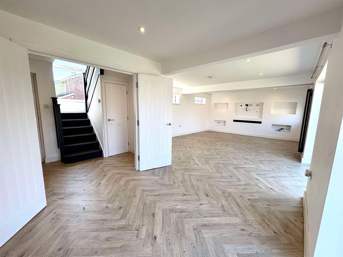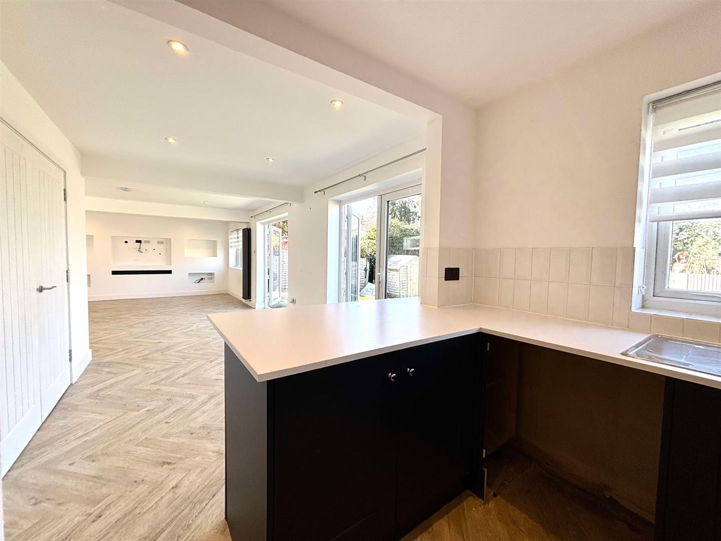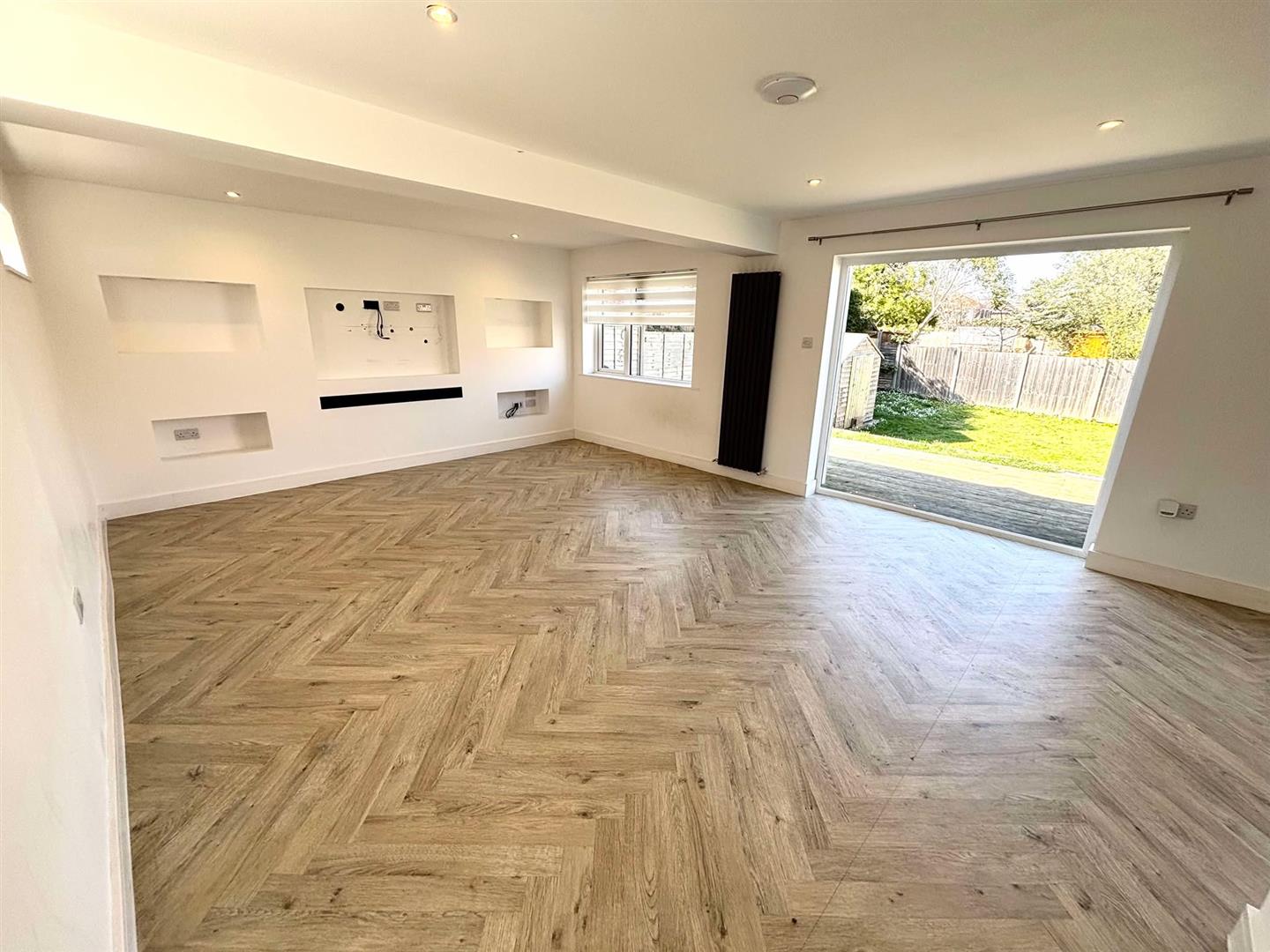 Inside, the property includes a convenient downstairs toilet. The open-plan living area creates a bright and airy feel, with a modern kitchen that flows into a spacious lounge/diner. Two sets of patio doors open to the garden, letting in plenty of natural light and making it easy to enjoy the outdoors. A stylish media wall adds a modern touch to the living space.