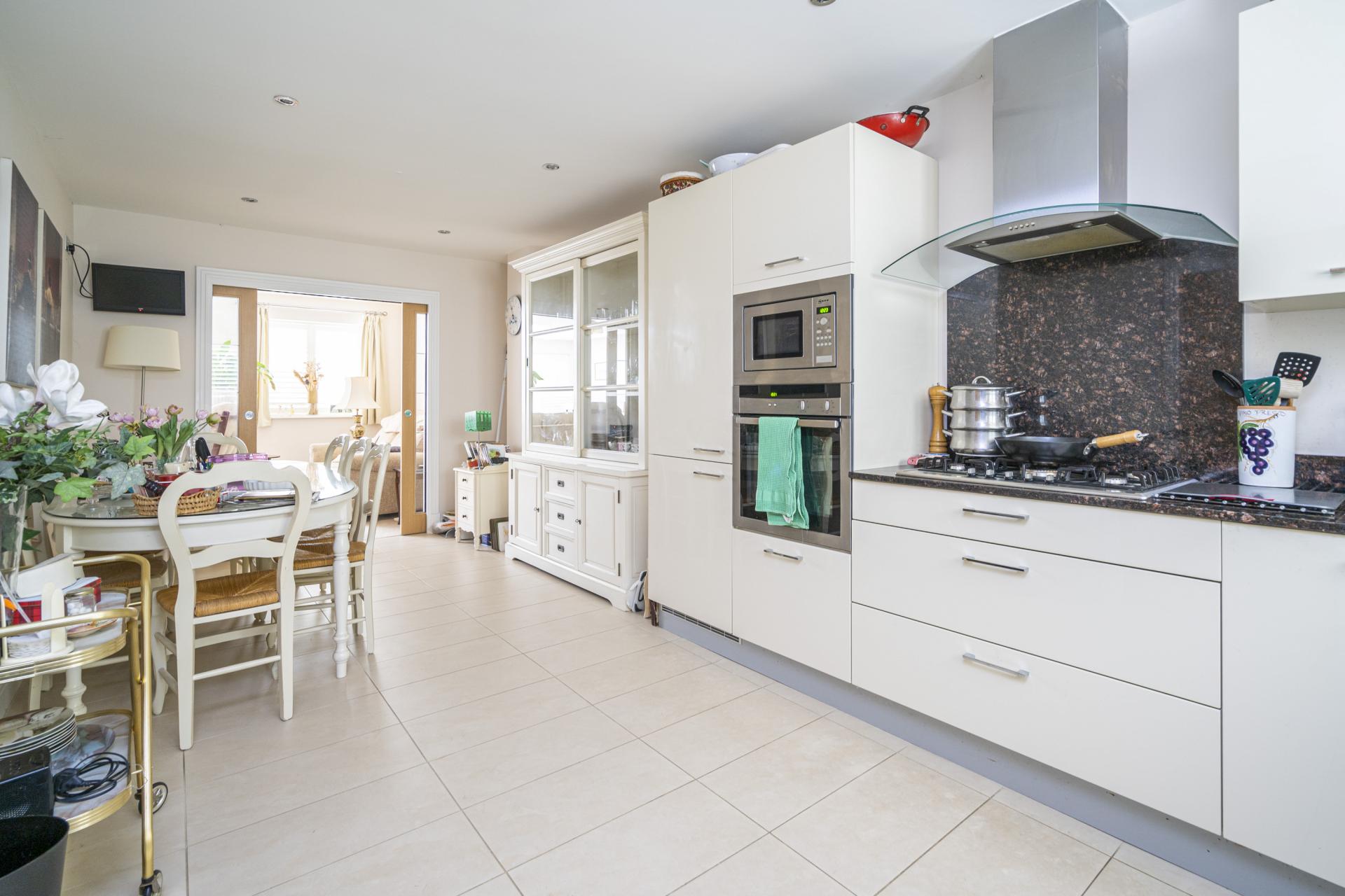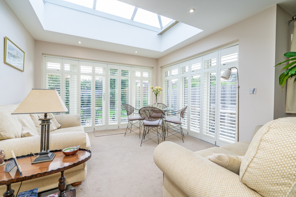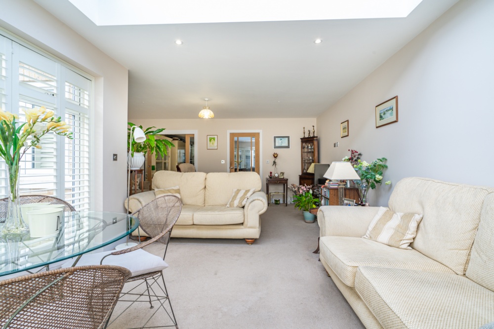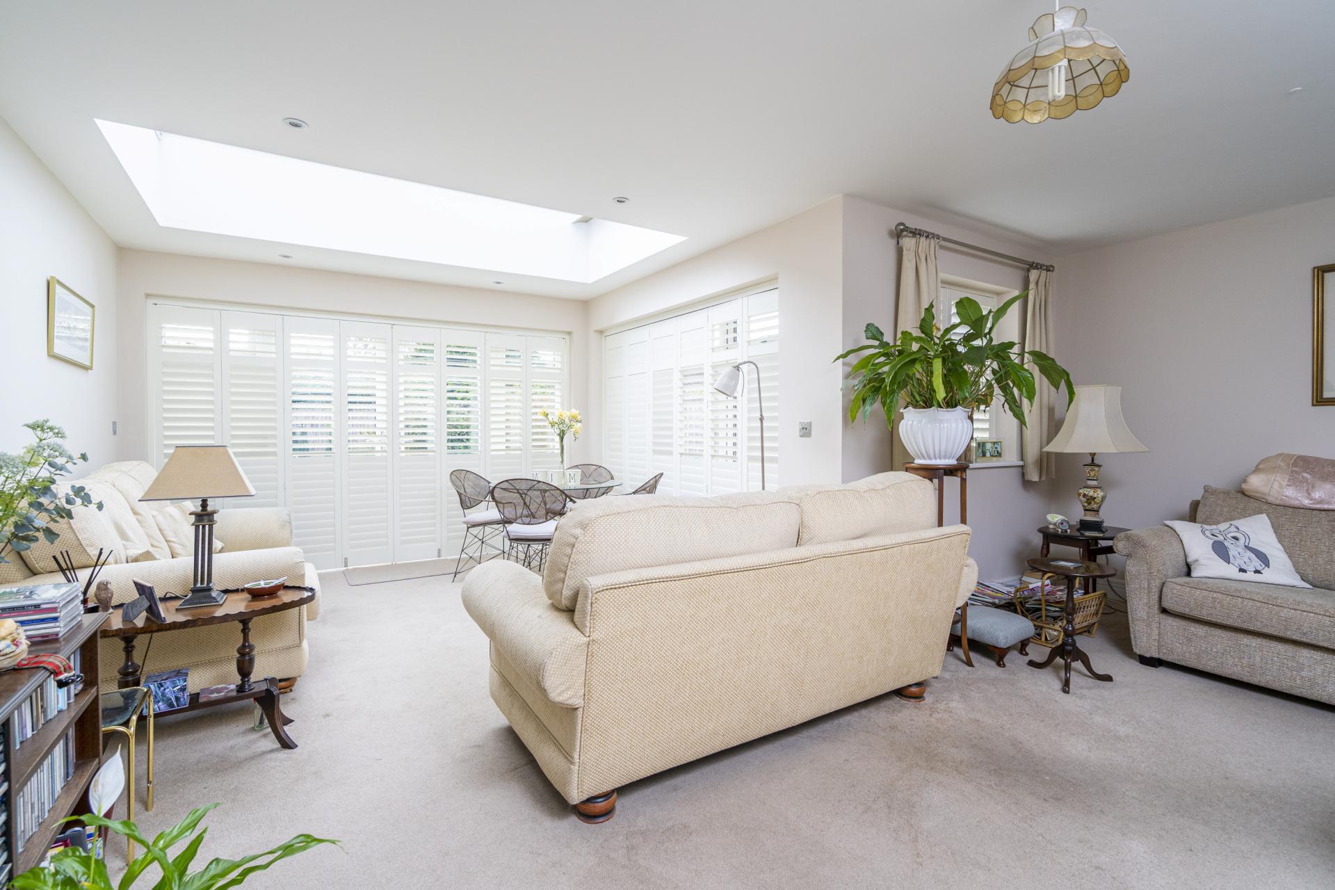The kitchen is well fitted with a range of floor and wall mounted units set to ample work top and incorporating a sink unit and integral appliances. There is a good sized dining area. Sliding doors lead to the living room which is a bright and spacious room with French doors leading to the south facing garden. There is underfloor heating and shutters fitted to all windows.