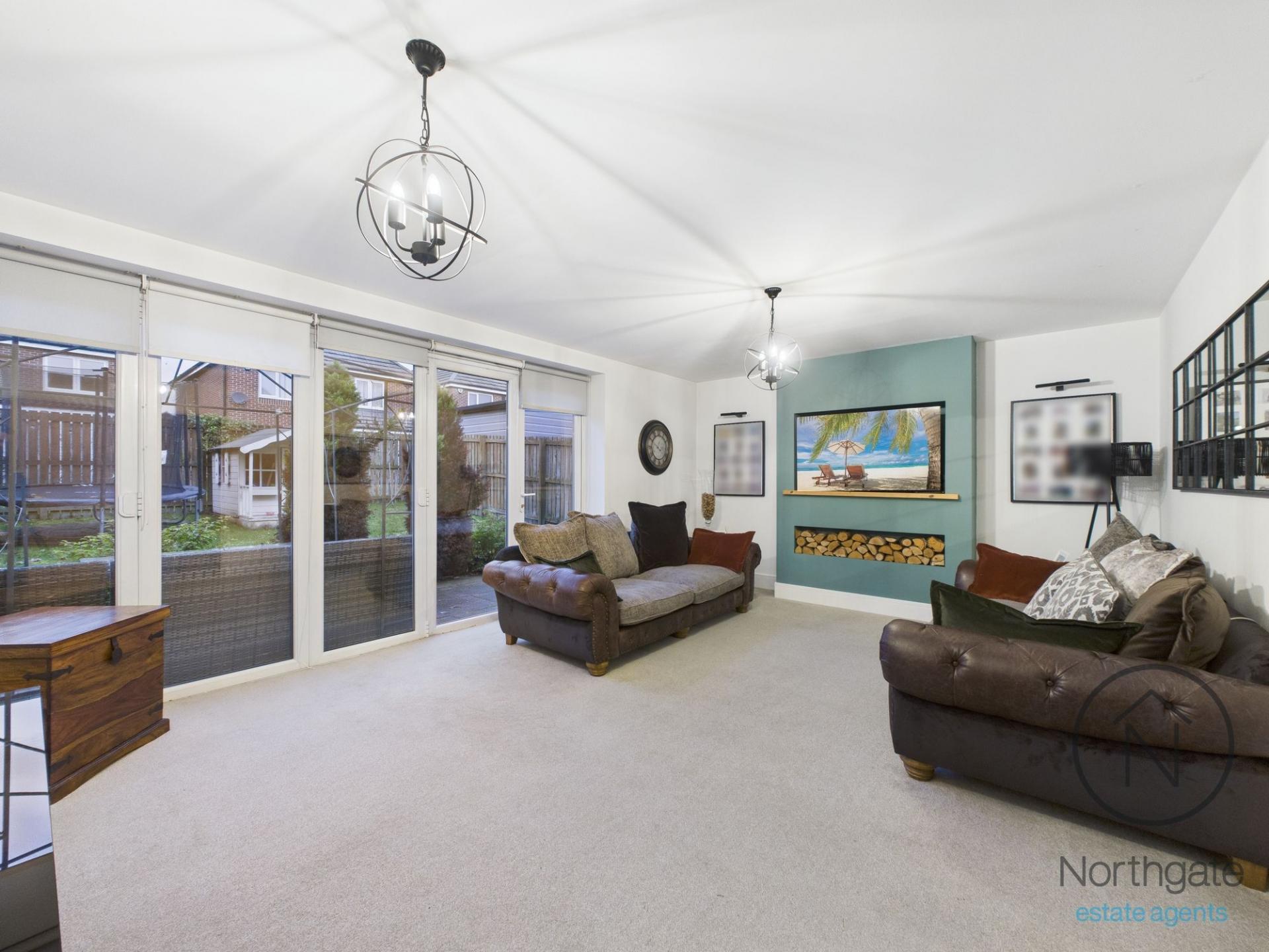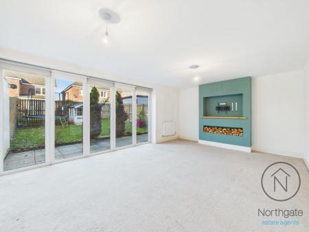 The spacious lounge is a standout feature, boasting bi-fold doors that open onto the rear garden, flooding the room with natural light and creating a seamless flow between indoor and outdoor living.