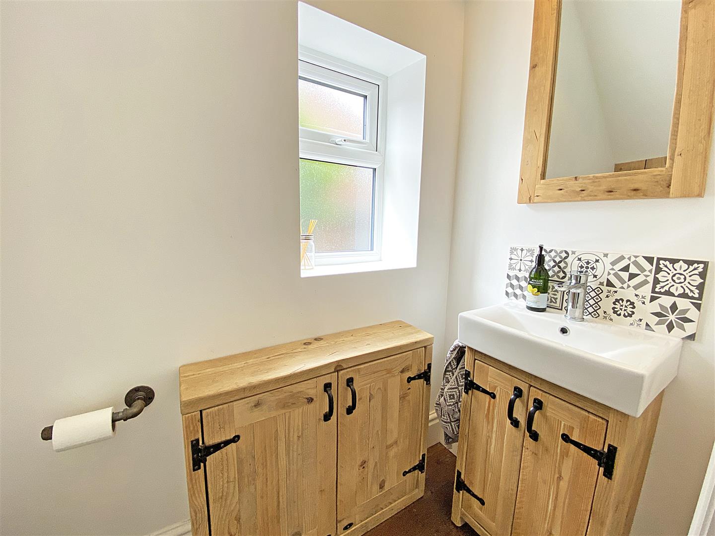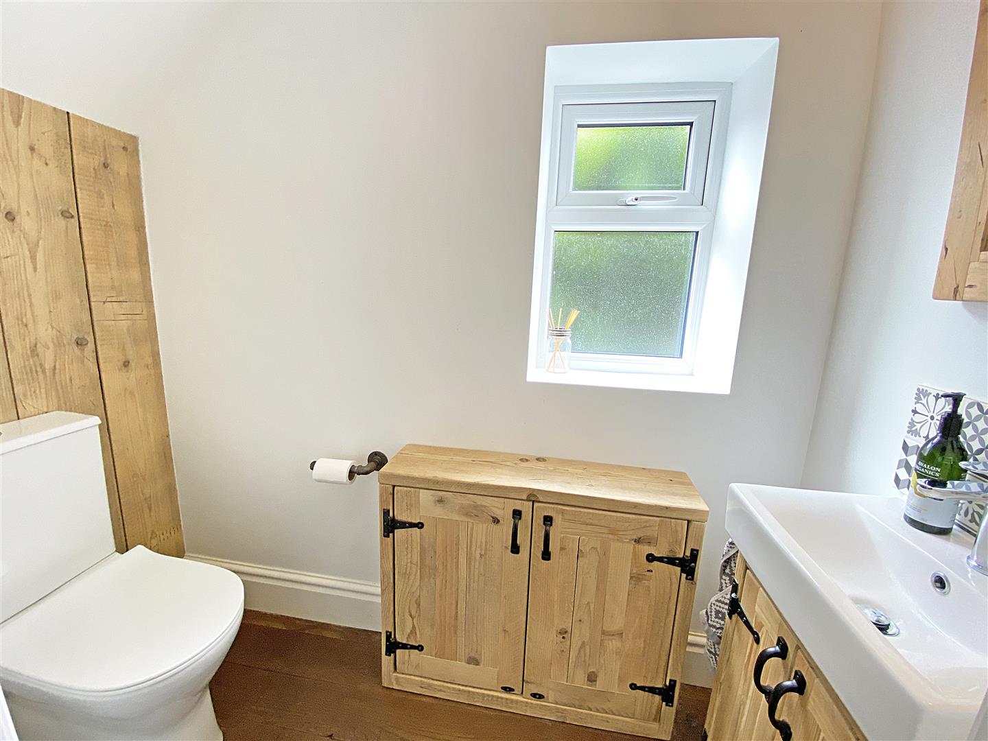 Cloaks Room - Upvc Double glazed window, laminate flooring, low level w.c. vanity wash hand basin with cupboard below and mixer tap, tiled splash back