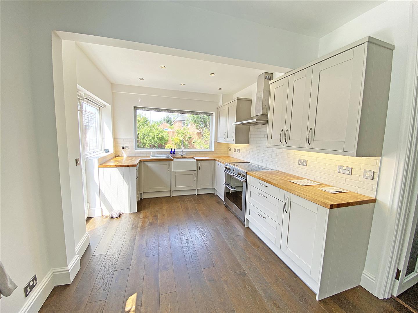 Kitchen Breakfast Room - UPVC Double glazed windows and exterior door to garden, wooden floor, kitchen comprises of a range of solid wooden base and wall units with appliances including, Induction Stoves Cooker cooker and hob, extractor hood, washing machine, dryer, dishwasher, fridge freezer, solid wooden work surfaces with inset Belfast sink with mixer tap.
