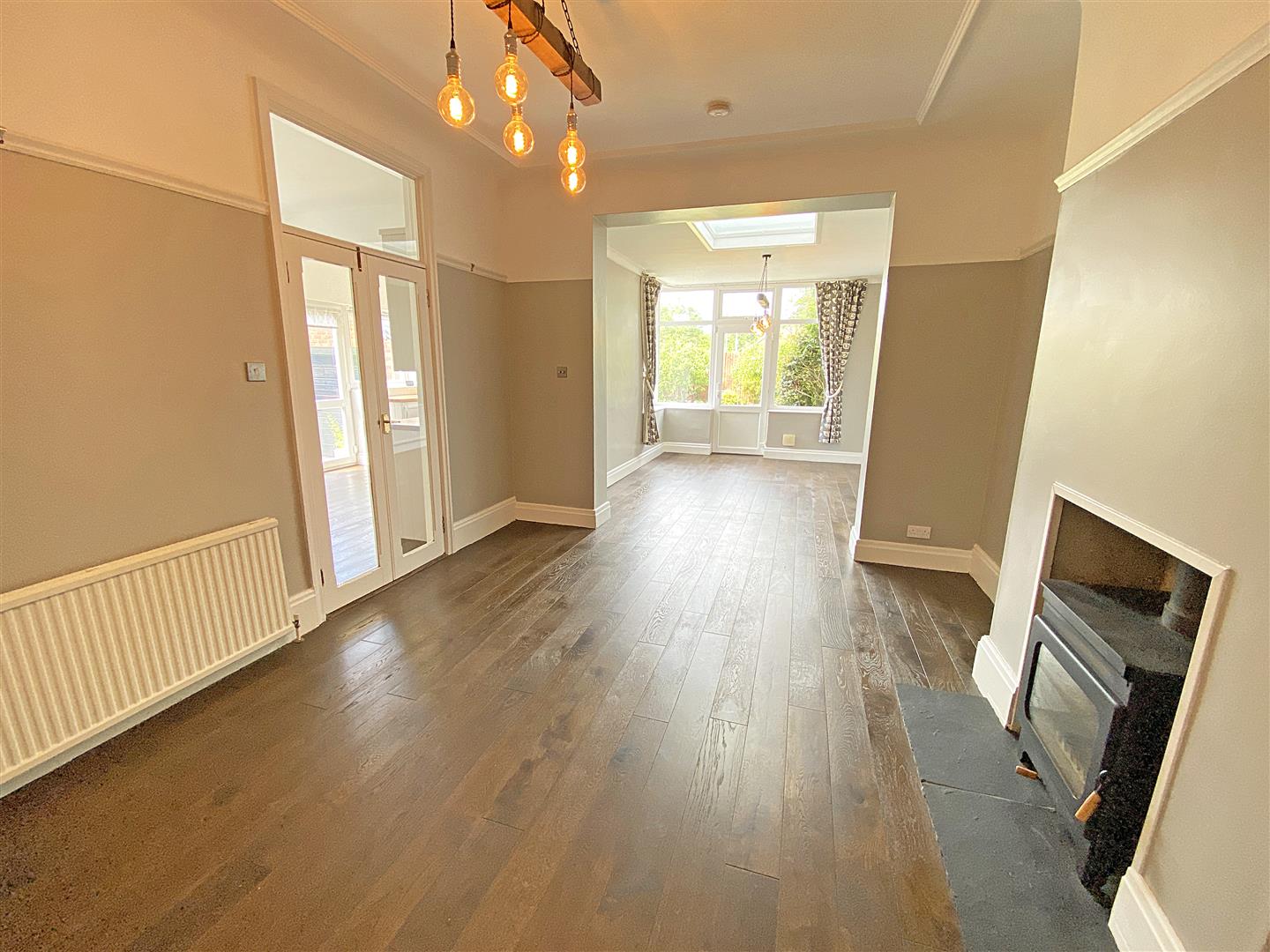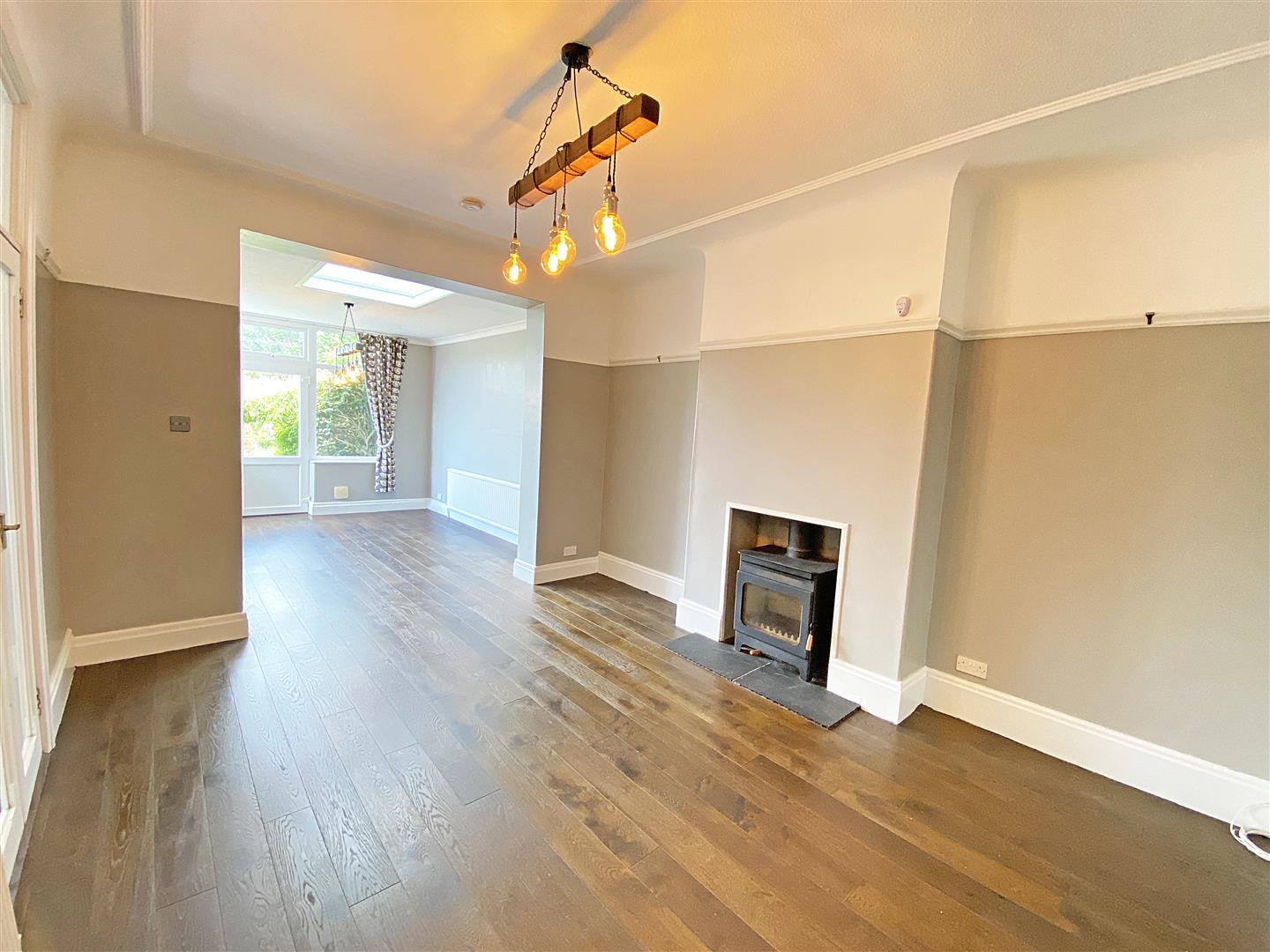 Rear Reception - UPVC Double glazed exterior door and windows, 2 x radiators, wood burner with tiled hearth, wood flooring
