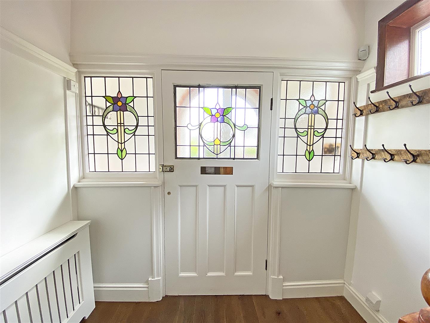 Hallway - wooden floor, staircase to first floor, coat hooks to wall, Radiator and cover