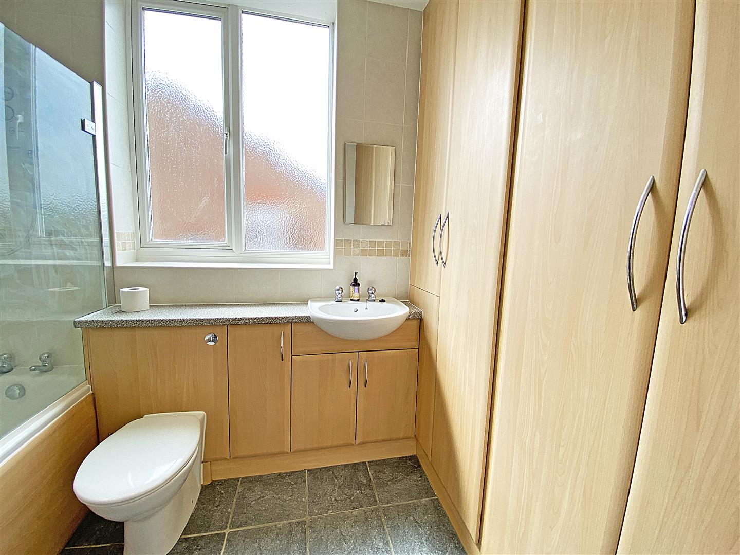 Bathroom - UPVC Double glazed window, Fully tiled walls and flooring, bathroom comprises of a white three piece suite including Bath with Electric shower over, shower screen, Vanity builty in Low level w.c. and wash basin. Large storage cupboards