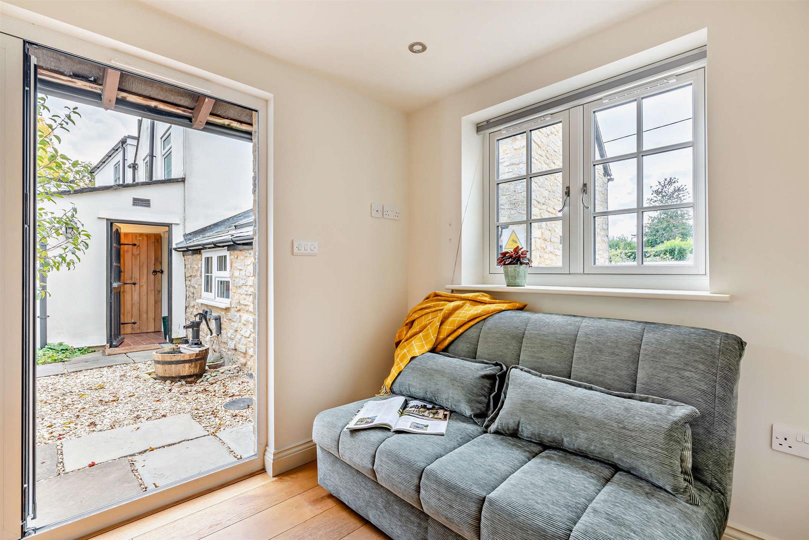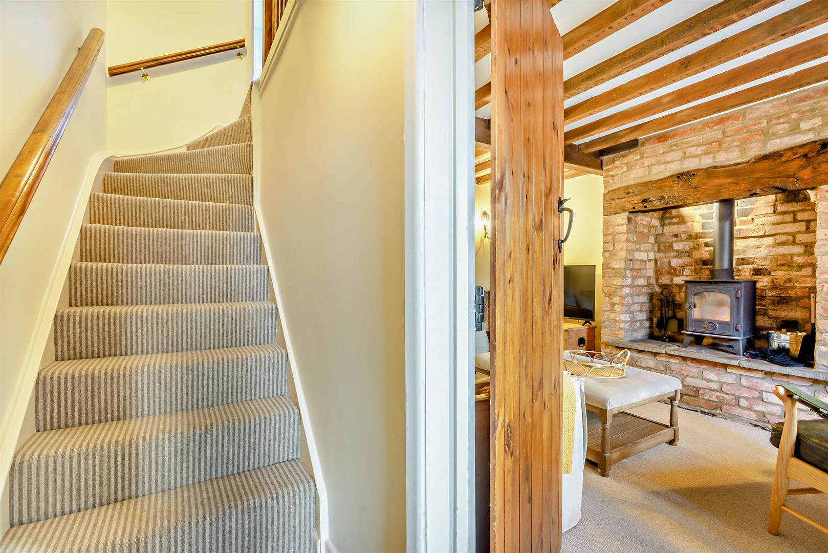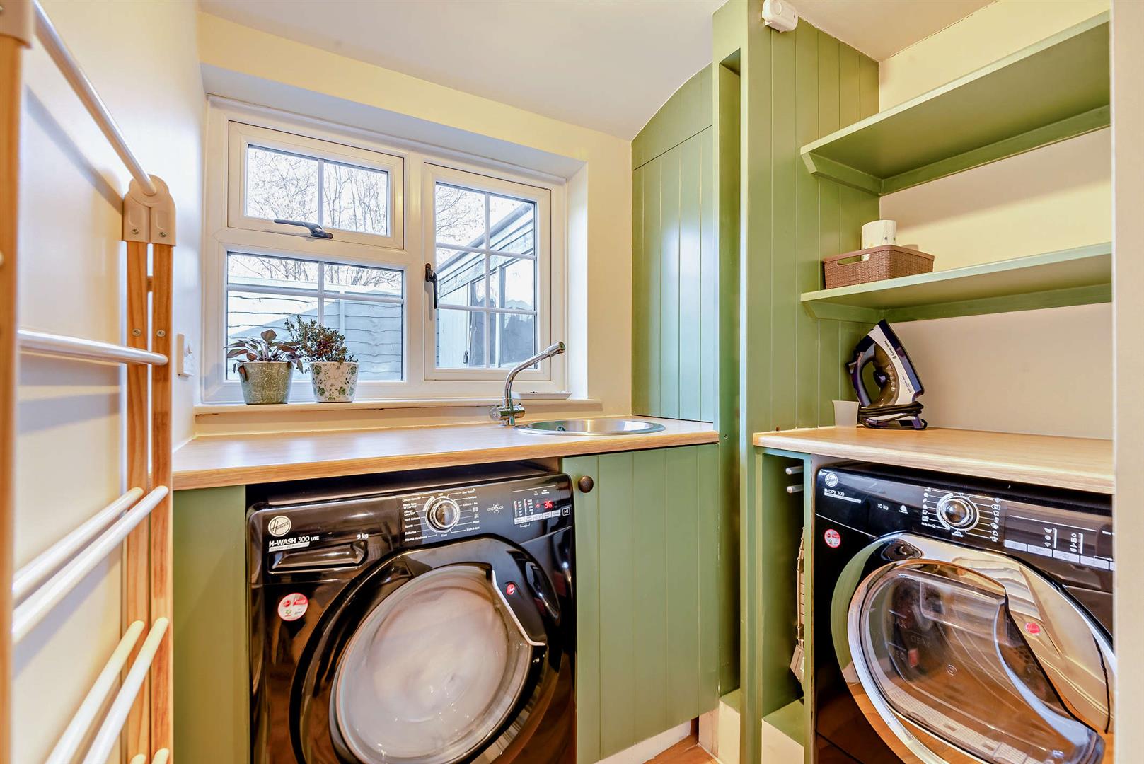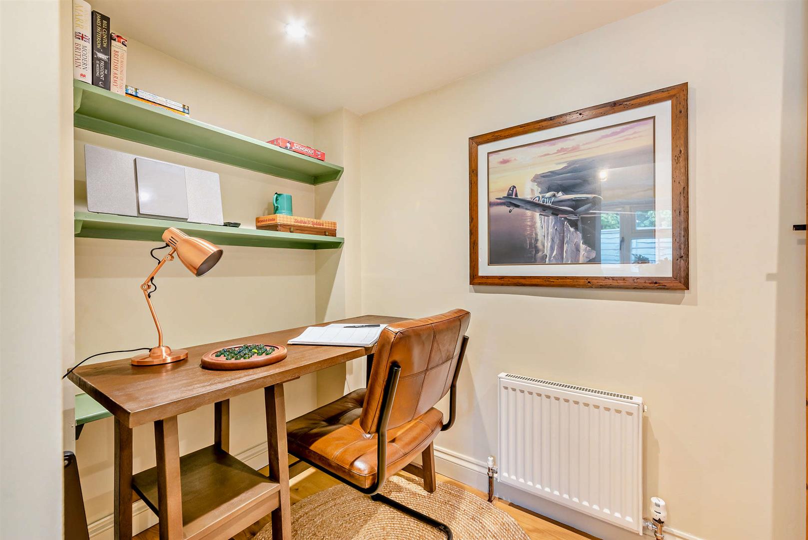 The kitchen is well-equipped with a Rangemaster cooker, ample storage, and unique slanted ceilings that enhance its cottage feel. From here, you'll find a convenient downstairs WC, access to the rear garden, and a separate utility room. A home office, ideal for remote working or study, completes the ground floor.