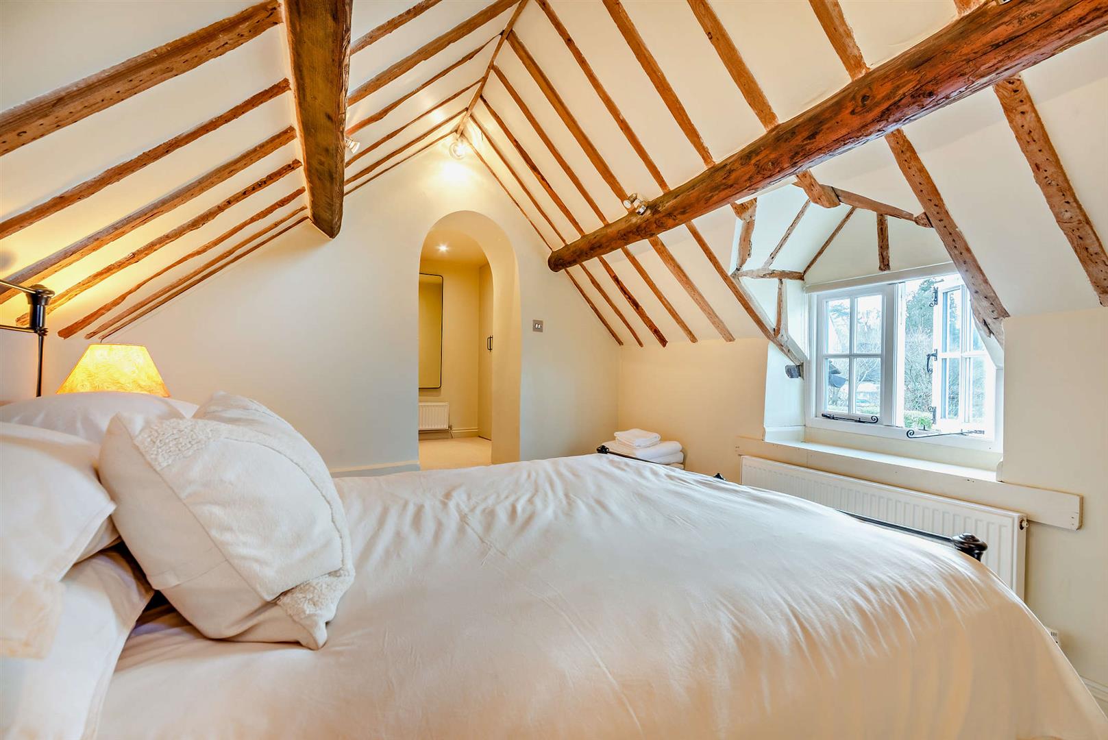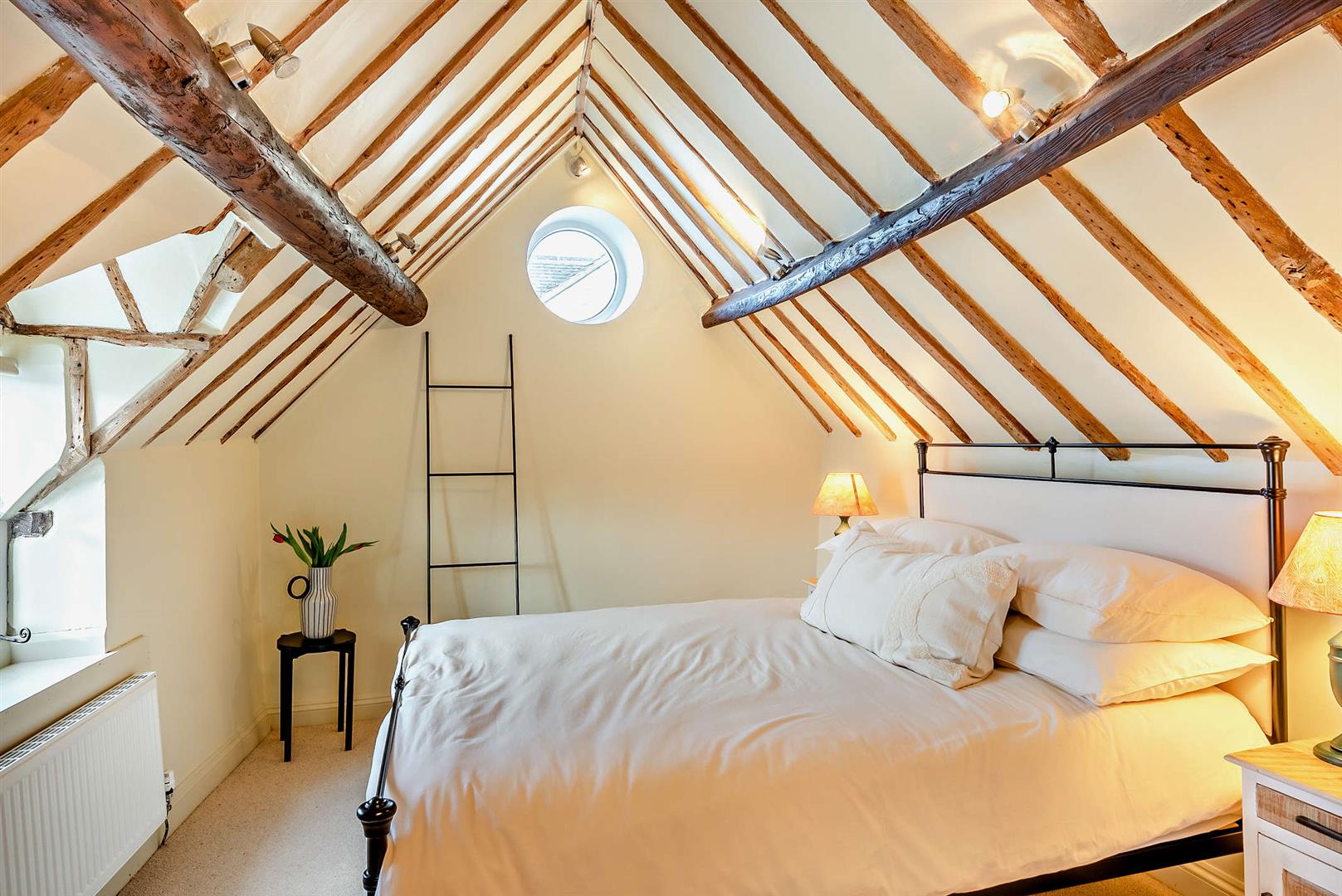 Upstairs, the master bedroom is a true retreat, featuring built-in wardrobes lining both sides of a walkway that leads to a tranquil sleeping area. The room is filled with charm, thanks to its wooden beams and angled ceilings. Two additional double bedrooms and a stylish family bathroom with a corner bath provide plenty of space for family or guests.