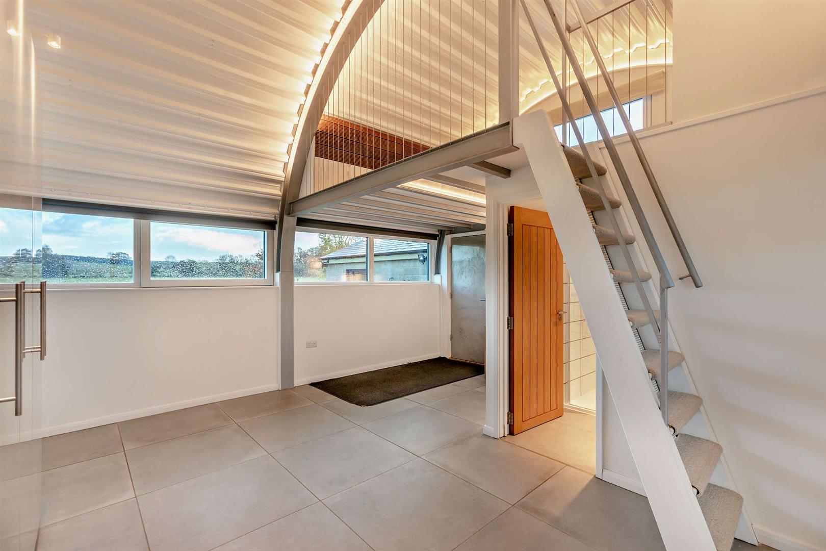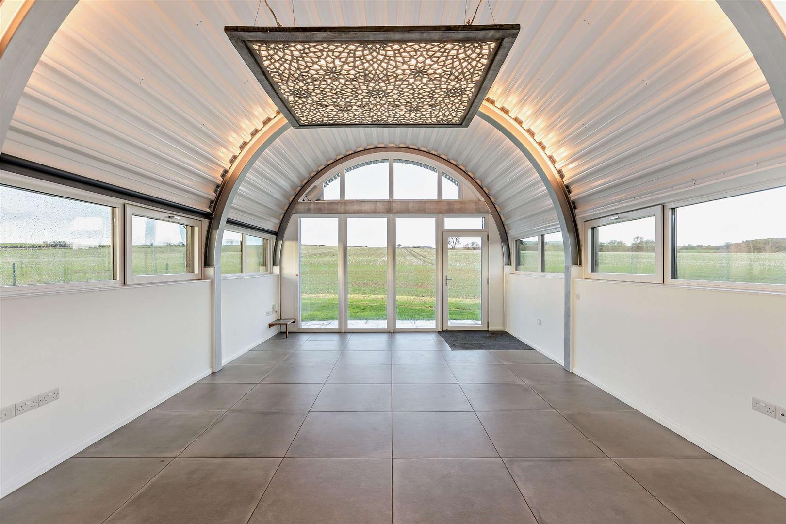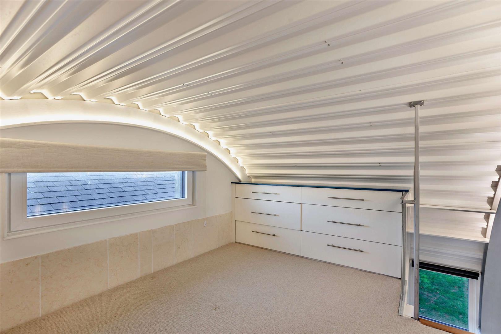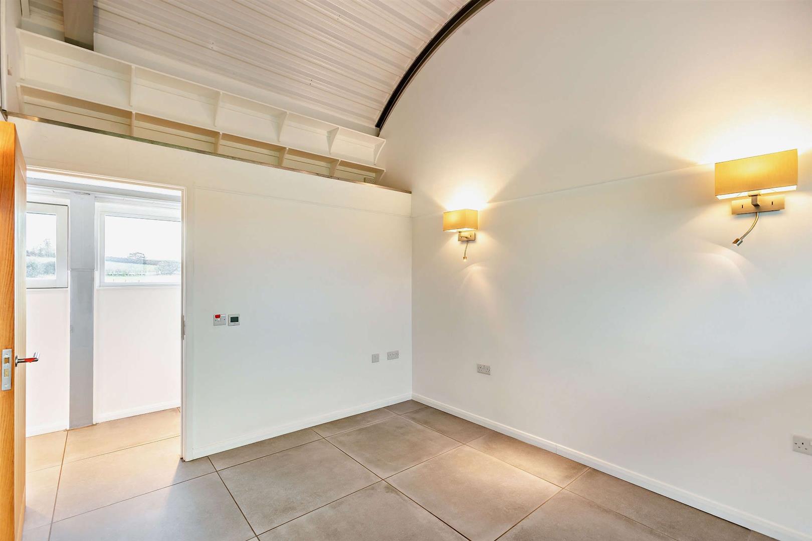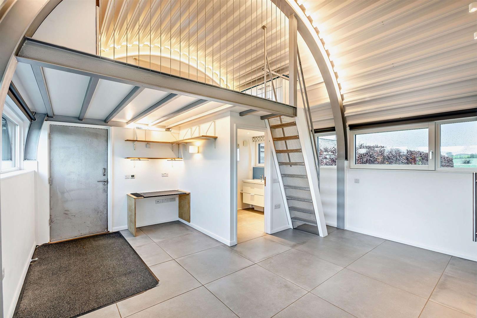 Inside is a spacious kitchen dining living area with windows down both sides that maximise the views, and the natural light. The double bedroom features sizeable fitted wardrobes, a desk/table space and again those extraordinary full width views to the fields. The rear room again has sizeable wardrobes, great storage and raised mezzanine area ideal for a double sleeping area, snug or workspace.