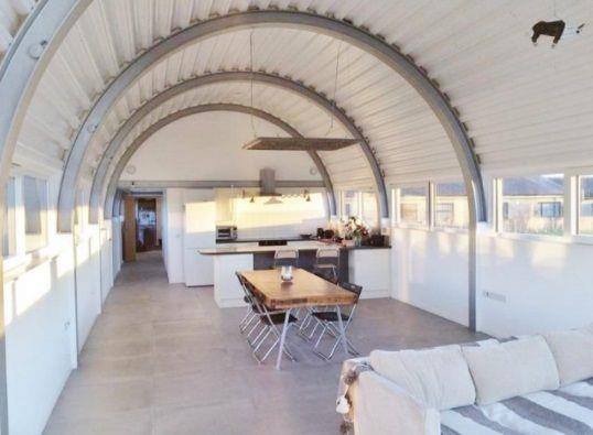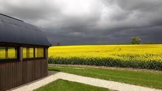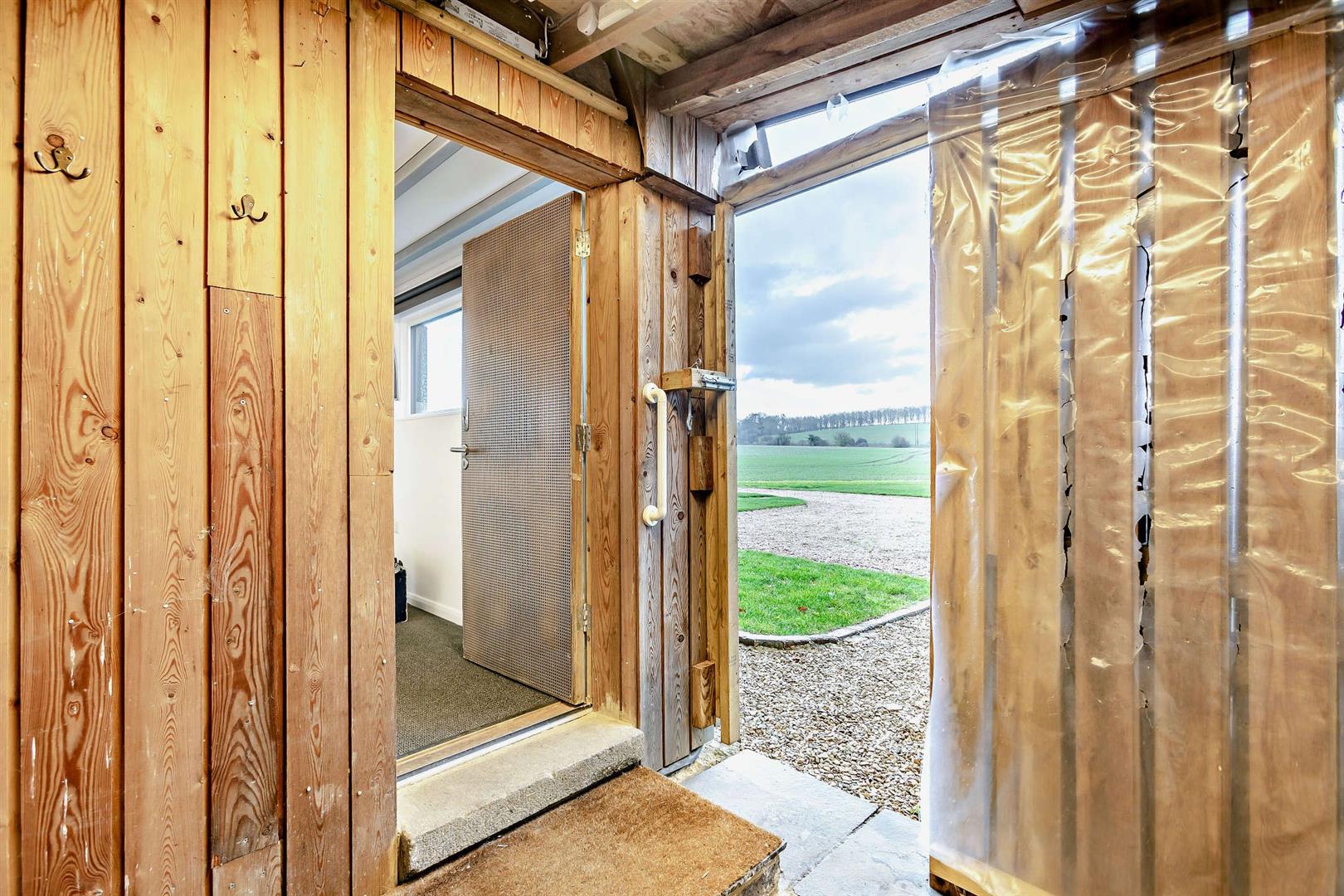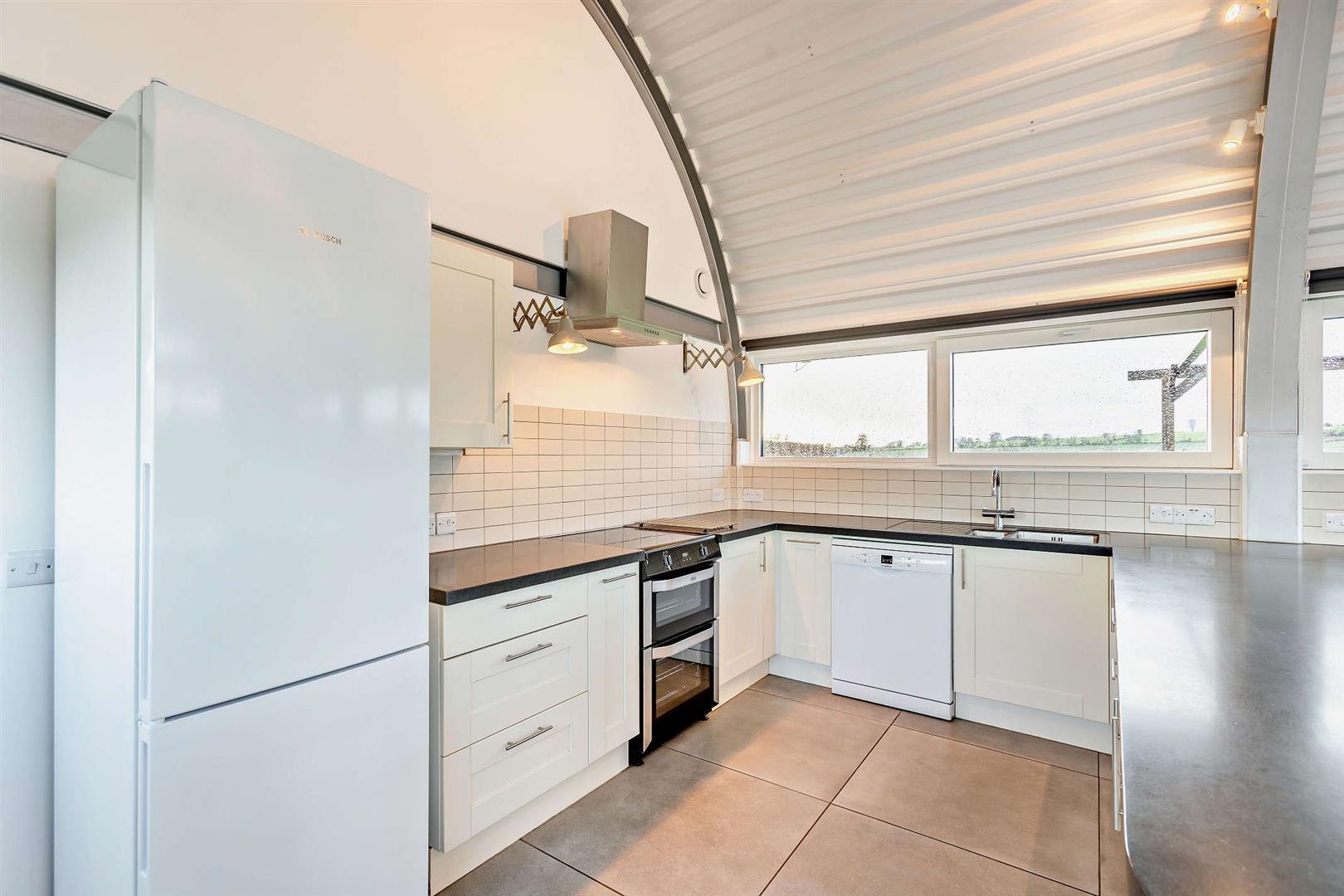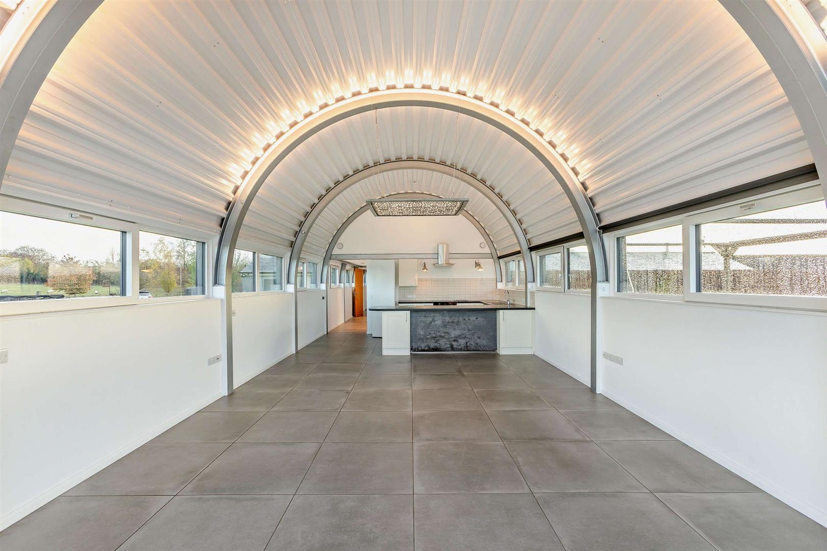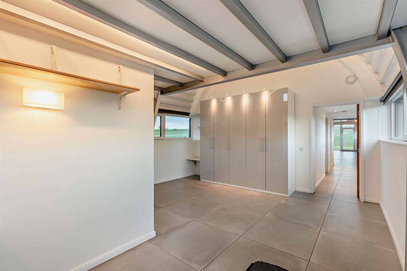 Inside is a spacious kitchen dining living area with windows down both sides that maximise the views, and the natural light. The double bedroom features sizeable fitted wardrobes, a desk/table space and again those extraordinary full width views to the fields. The rear room again has sizeable wardrobes, great storage and raised mezzanine area ideal for a double sleeping area, snug or workspace.
