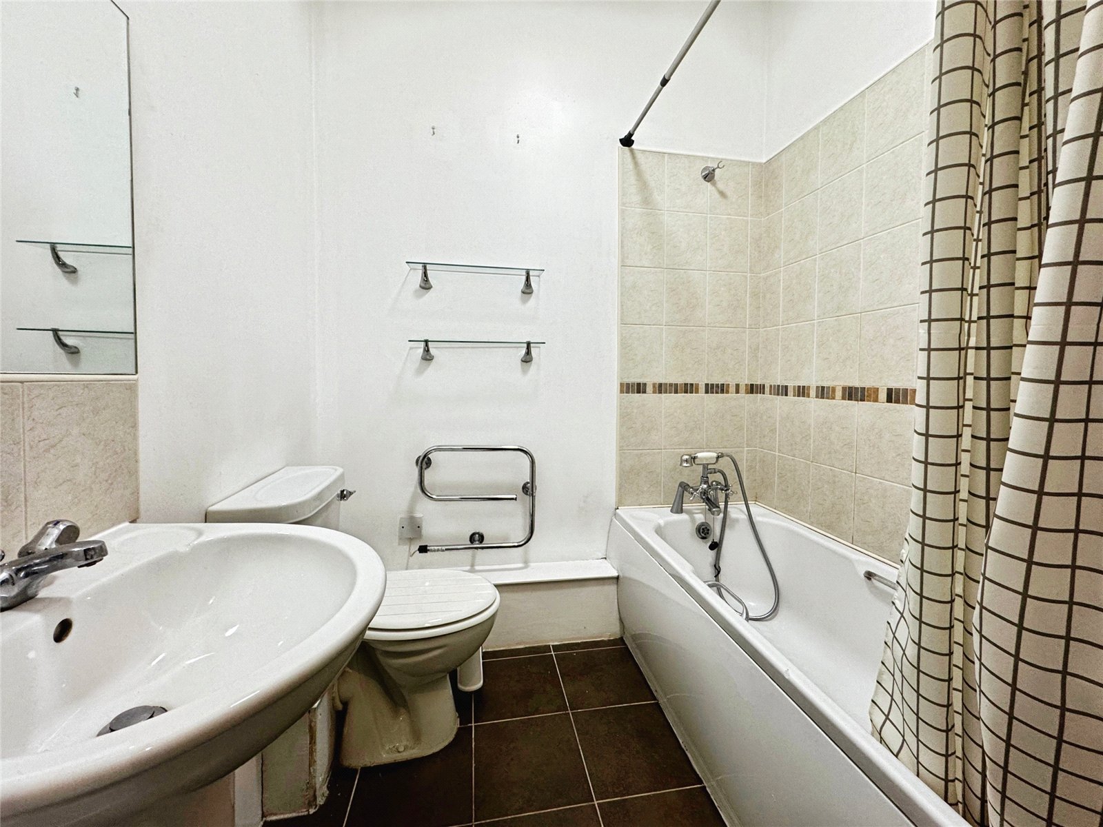 Panel bath with shower attachment, part tiled walls, tiled flooring, pedestal wash basin, WC, towel rail radiator