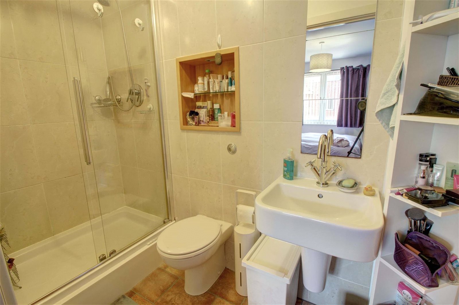 Shower in tiled cubicle, pedestal wash basin, WC, heated towel rail.