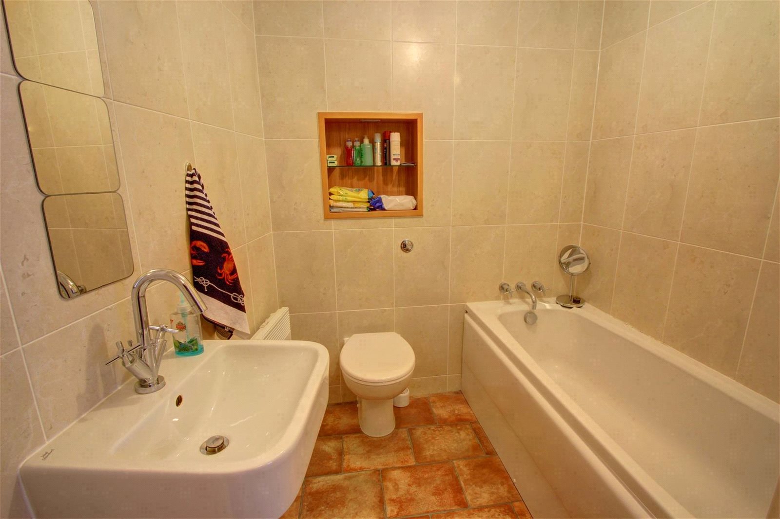 Panel bath, fully tiled walls, pedestal wash basin, WC, wall mounted electric heater.