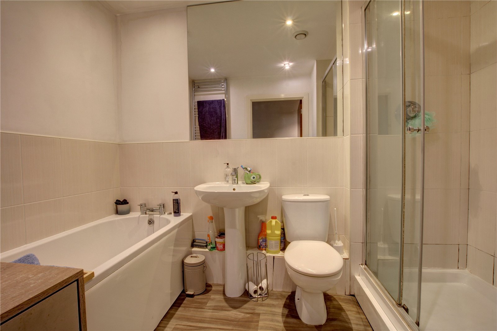 Panel bath, shower in cubicle, wash hand basin, WC.