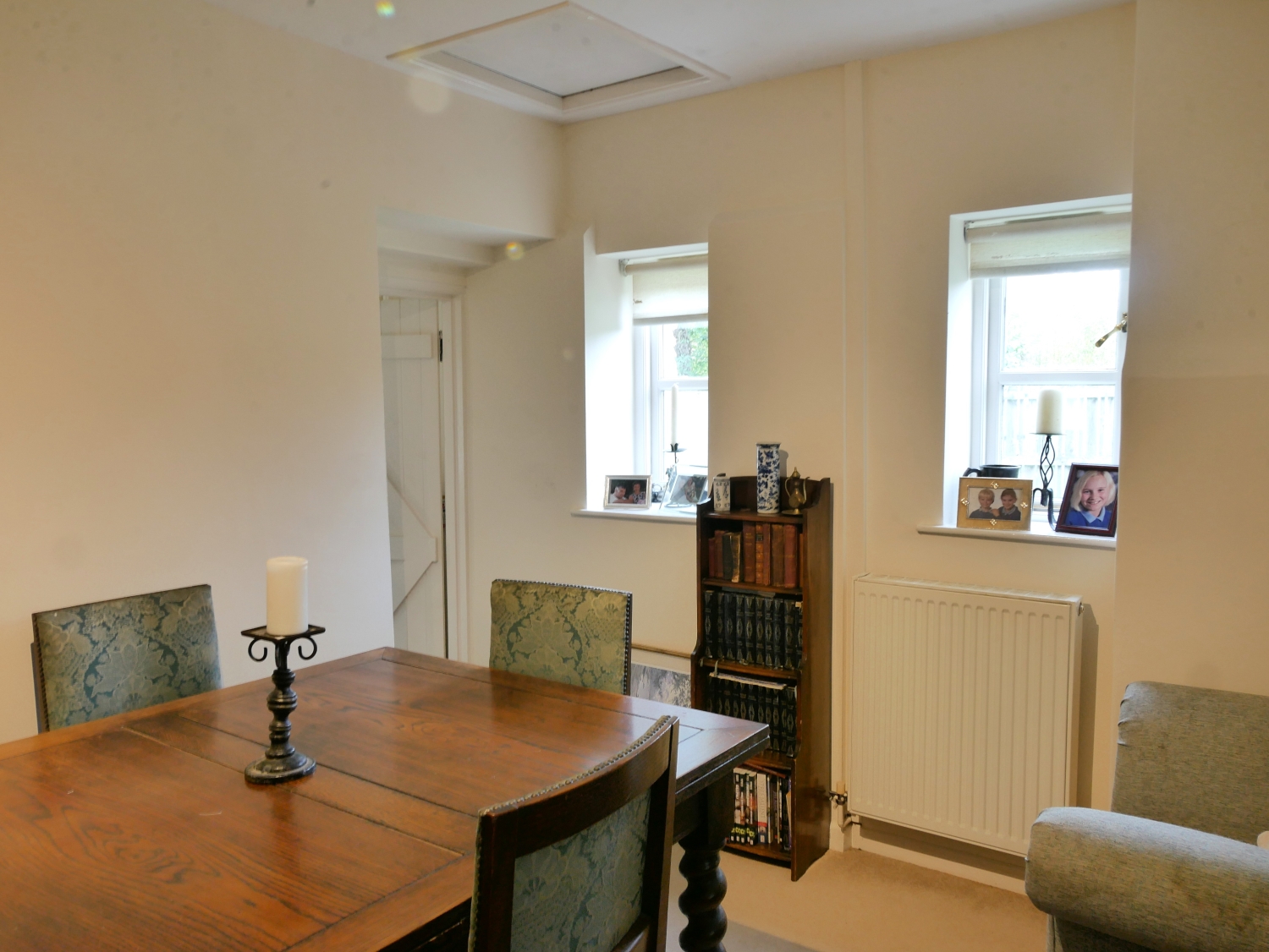 The ground floor features a well-appointed kitchen, a useful cloakroom, and a welcoming dining hall that opens into a bright, dual-aspect sitting room with a feature fireplace. From here, a further reception room provides versatile space to be used as a playroom, study, or third double bedroom.