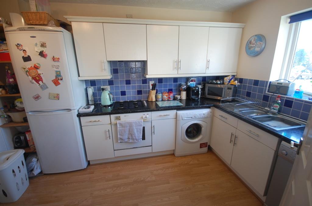 Double glazed window to front, range of matching base and wall units with roll top edged work surfaces incorporating stainless steel one and a half bowl sink and drainer unit with central mixer taps, built-in electric cooker with gas hob and extractor hood over, space for fridge/freezer and washing machine, space for dishwasher, wall-mounted boiler, laminate flooring and textured ceiling.