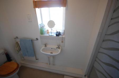 Single shower, low level WC, wash and basin with tiled splashbacks, shaver point, extractor fan, radiator, carpet to floor and smooth ceiling with sunken spotlights.