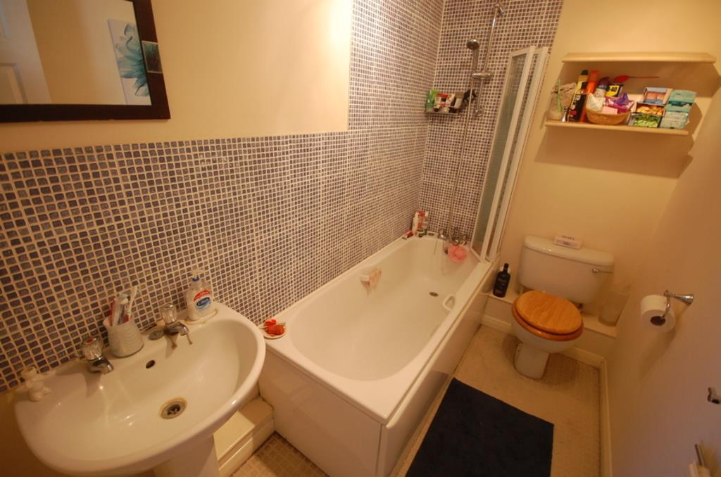 Panelled bath with mixer taps and shower attachment over, low level WC, wash hand basin with tiled splashbacks, radiator, carpet to floor and textured ceiling.