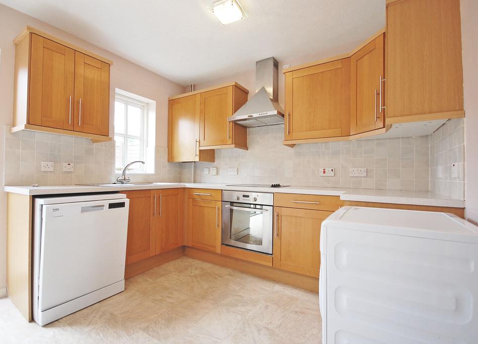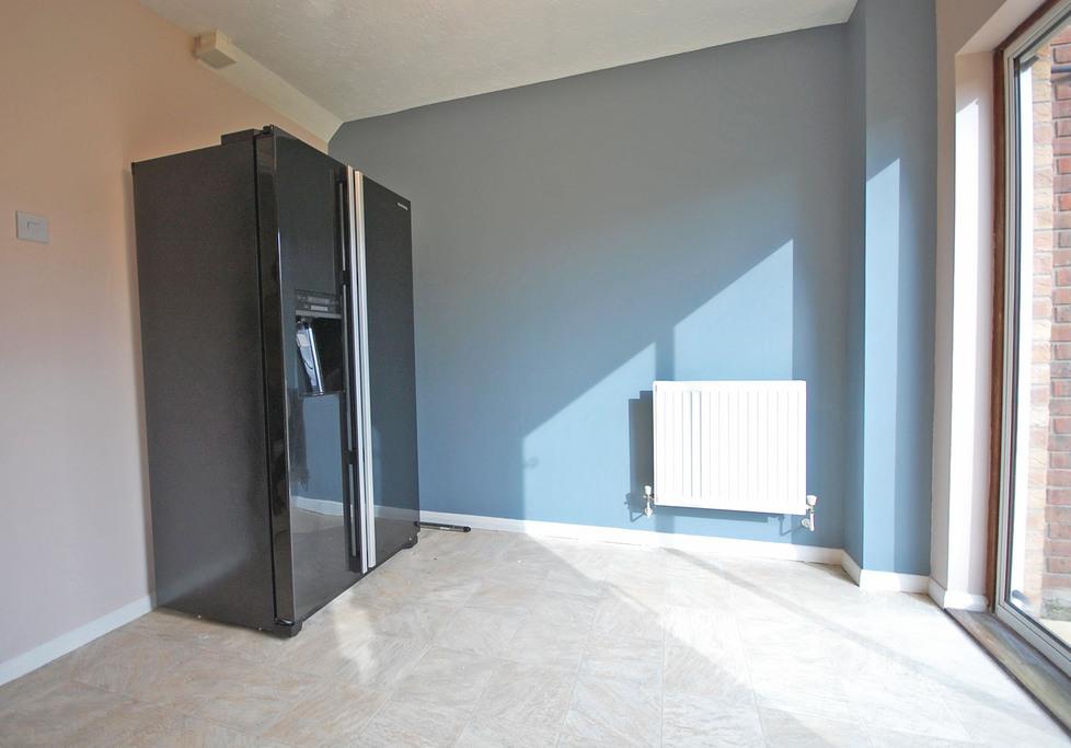Double glazed window to rear, matching wall and base units with roll top work surfaces and tiled splash backs, bowl sink and drainer with central mixer taps, built in oven, electric hob and extractor, freestanding American fridge/freezer, dishwasher & washing machine. boiler in cupboard, radiator, vinyl flooring, textured ceiling, patio doors to rear garden.