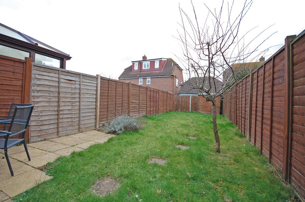 Enclosed rear garden, with rear access to parking area, hardstanding patio area, garden mainly laid to lawn with mature shrubs and tree.