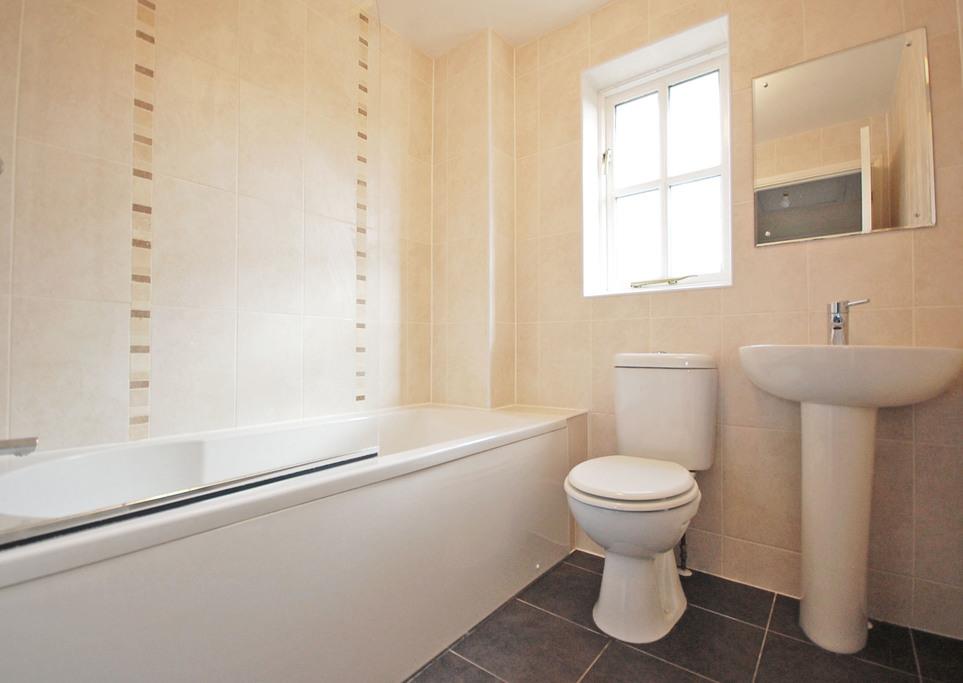 Double glazed window to rear, panelled bath with central mixer taps, pedestal wash hand basin, low level WC, fully tiled walls, heated towel rail, tiled flooring, smooth ceiling.