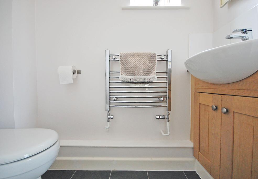Double glazed opaque window to side aspect, low level WC, inset wash hand basin, vinyl flooring, heated towel rail, smooth ceiling.