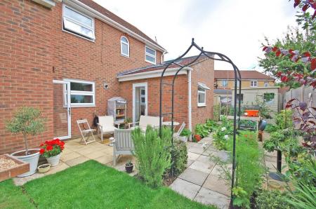 Enclosed and fenced rear garden with side access via gate, laid to lawn area, hard standing paved patio areas, shed.