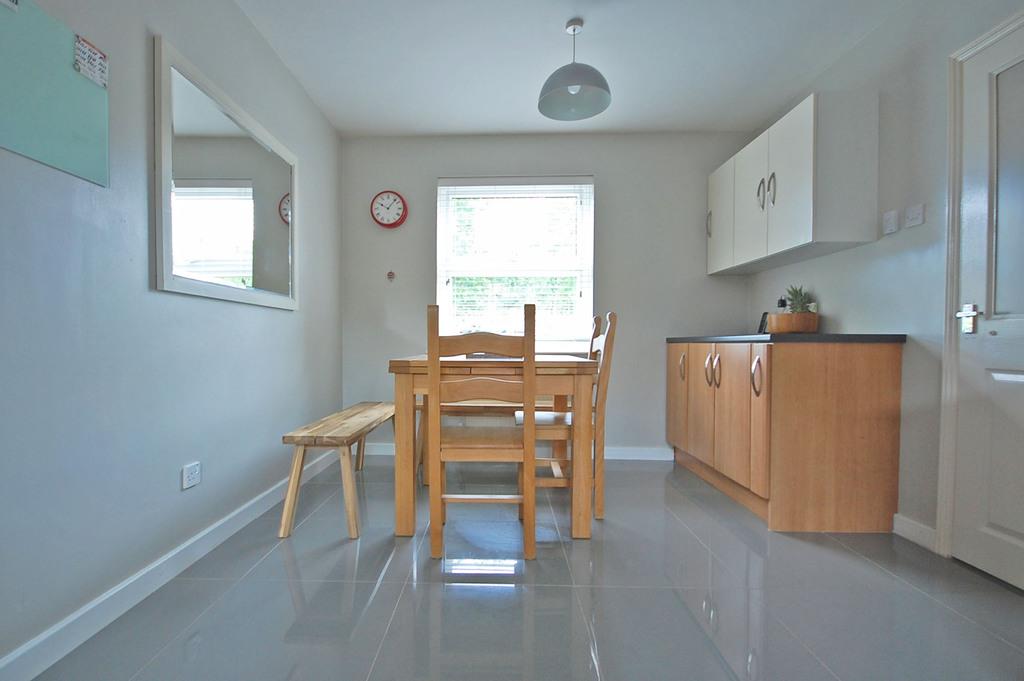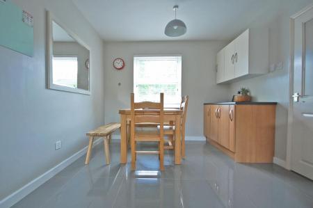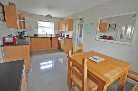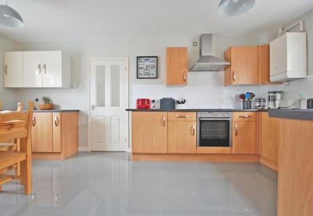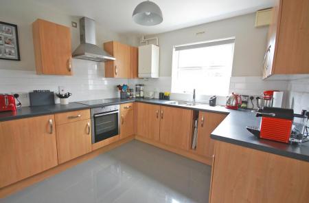 Double glazed windows to front and rear aspects, matching wall and base units with tiled splashbacks, one and a half bowl sink and drainer with central mixer taps, built-in oven, electric hob with extractor over, space for dishwasher, wall-mounted boiler, radiator, tiled flooring, smooth ceiling. Door to utility room.