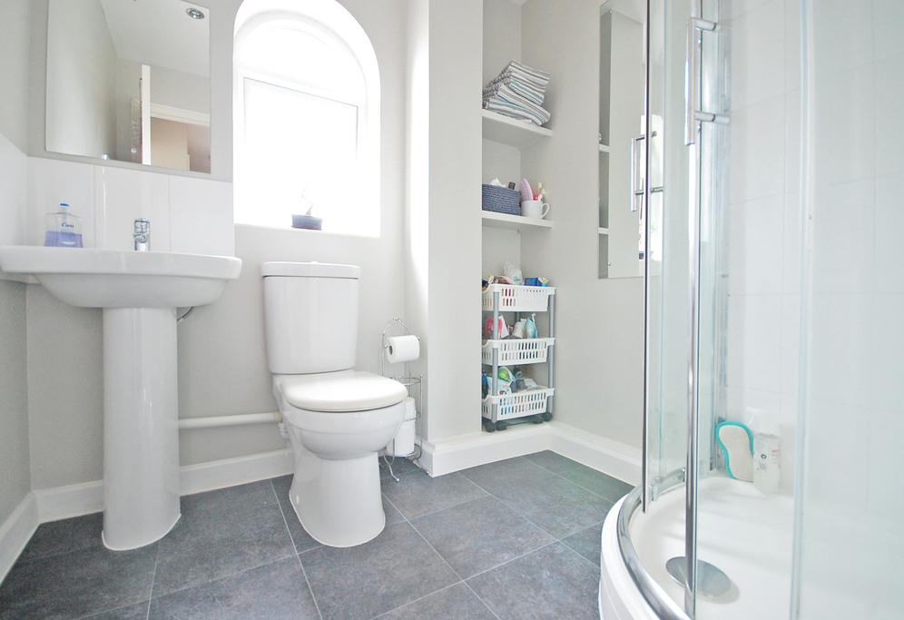 Opaque double glazed window to rear aspect, enclosed corner shower unit with electric power shower, low level WC, pedestal wash hand basin, tiled flooring, heated towel rail, vinyl flooring, smooth ceiling.