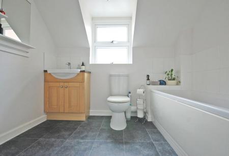 Double glazed opaque window to front aspect, vanity wash hand basin, heated towel rail, panelled bath with central mixer taps, smooth ceiling, vinyl flooring.