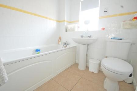 Opaque double glazed window to front aspect, panelled bath with central mixer tap and shower attachment, low level WC, pedestal wash hand basin, shaver point, extractor fan, radiator, tiled flooring.