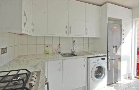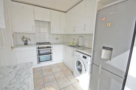 Double glazed window to rear aspect, a series of matching base and wall units, edged work surfaces incorporating single bowl sink with drainer and central mixer tap, built-in oven, gas hob with extractor hood, space for fridge/freezer and washing machine, tiled flooring. Door to rear garden.