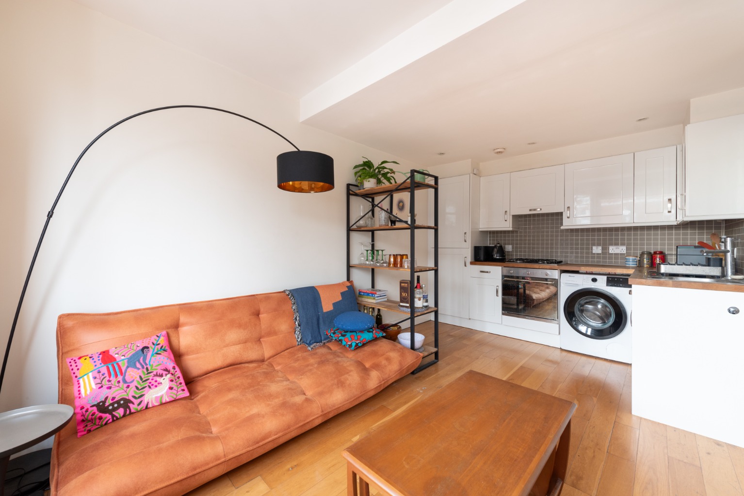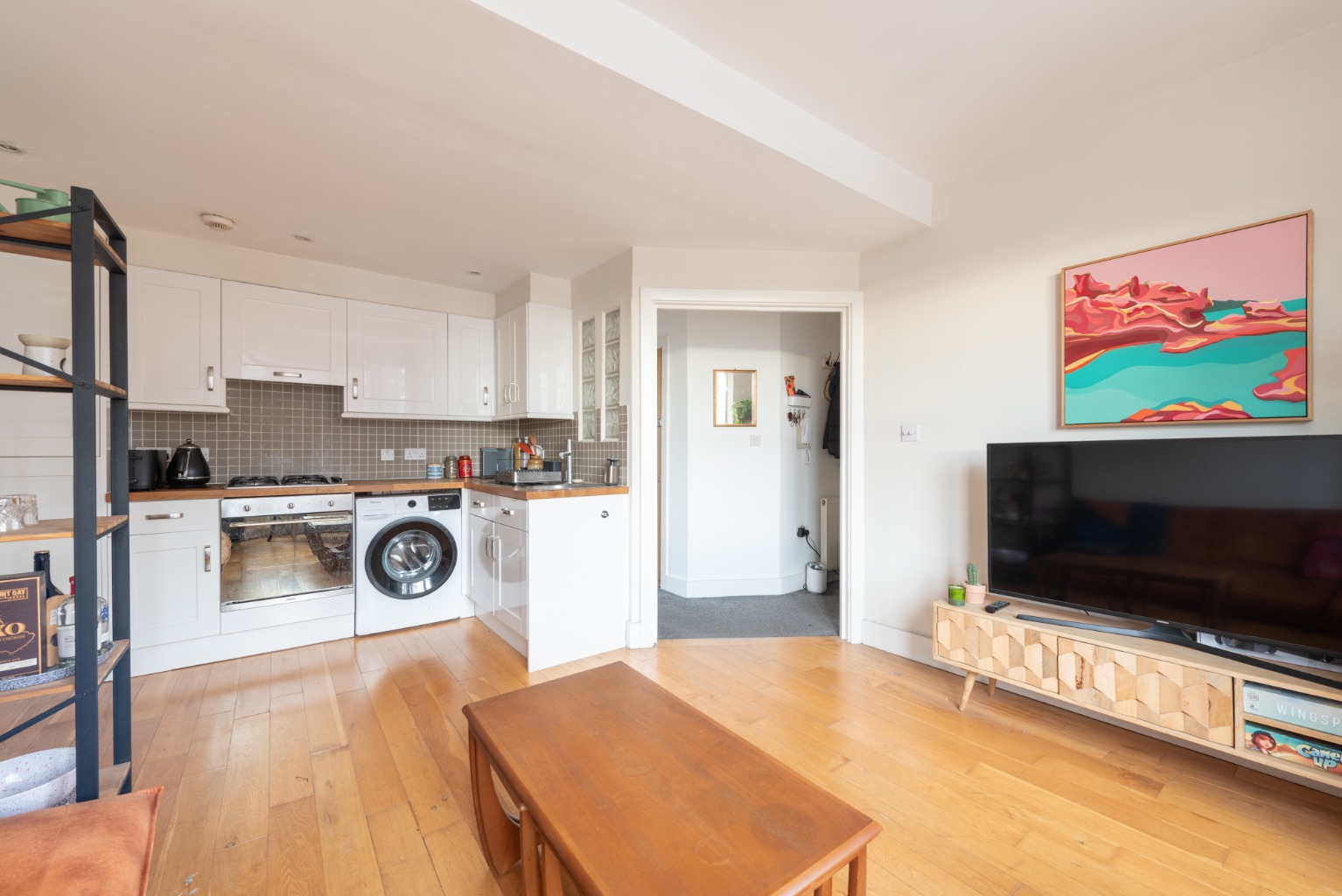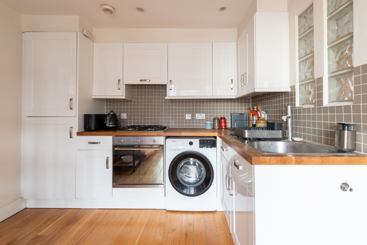 As you enter from the front door, to the right and across the hallway is bedroom two – which has a large sash window looking out to the rear of the property. The room offers a built-in storage cupboard which leaves room for a bed, side cabinets and additional chests of drawers. Back to the hallway and on your right, you’ll find a wide squared archway which leads into the bright reception room. A large east-facing bay with tall sash windows provides exceptional natural light and there’s generous room for a large settee, entertainment unit and bookcases. The size of the room would allow for a large, stylish centre rug completed by a feature coffee table. Opposite the bay window, at the far end of this large room is the kitchen area. The L-shaped design includes a range of base and wall cabinets and a full height, integrated fridge/freezer. Cabinets are gloss white in a shaker-style with modern chrome handles, and the countertops are in a high-quality solid timber. There’s a stainless-steel sink with modern chrome mixer tap, a washing machine, a built-in stainless-steel cooker and a gas hob with extractor above.