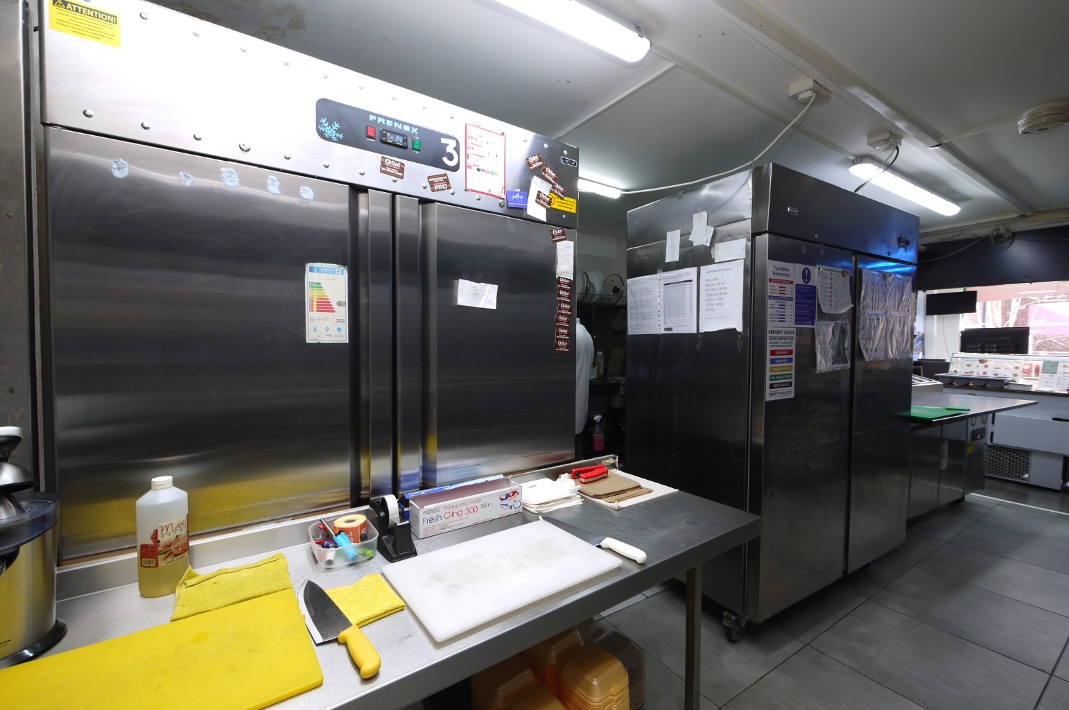 KEY POINT:CCTVDISPLAY AT FRONTFOOD CHILLER GLASS DISPLAYCUSTOMER TOILET2 x DOUBLE FREEZERPIZZA DOUGH MACHINEDOUBLE DIP FRYERSGS OVEN5 x 4 SEATS