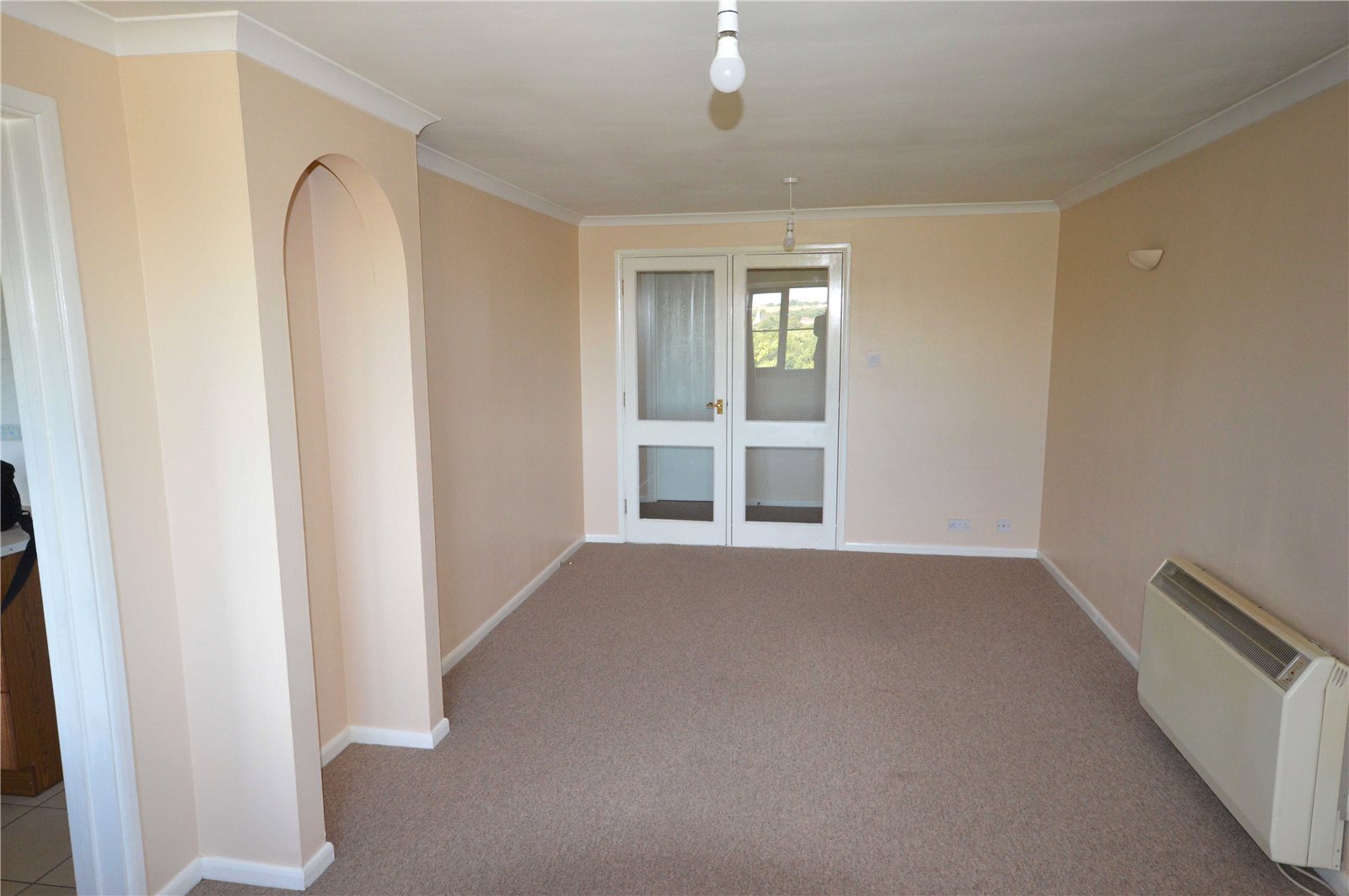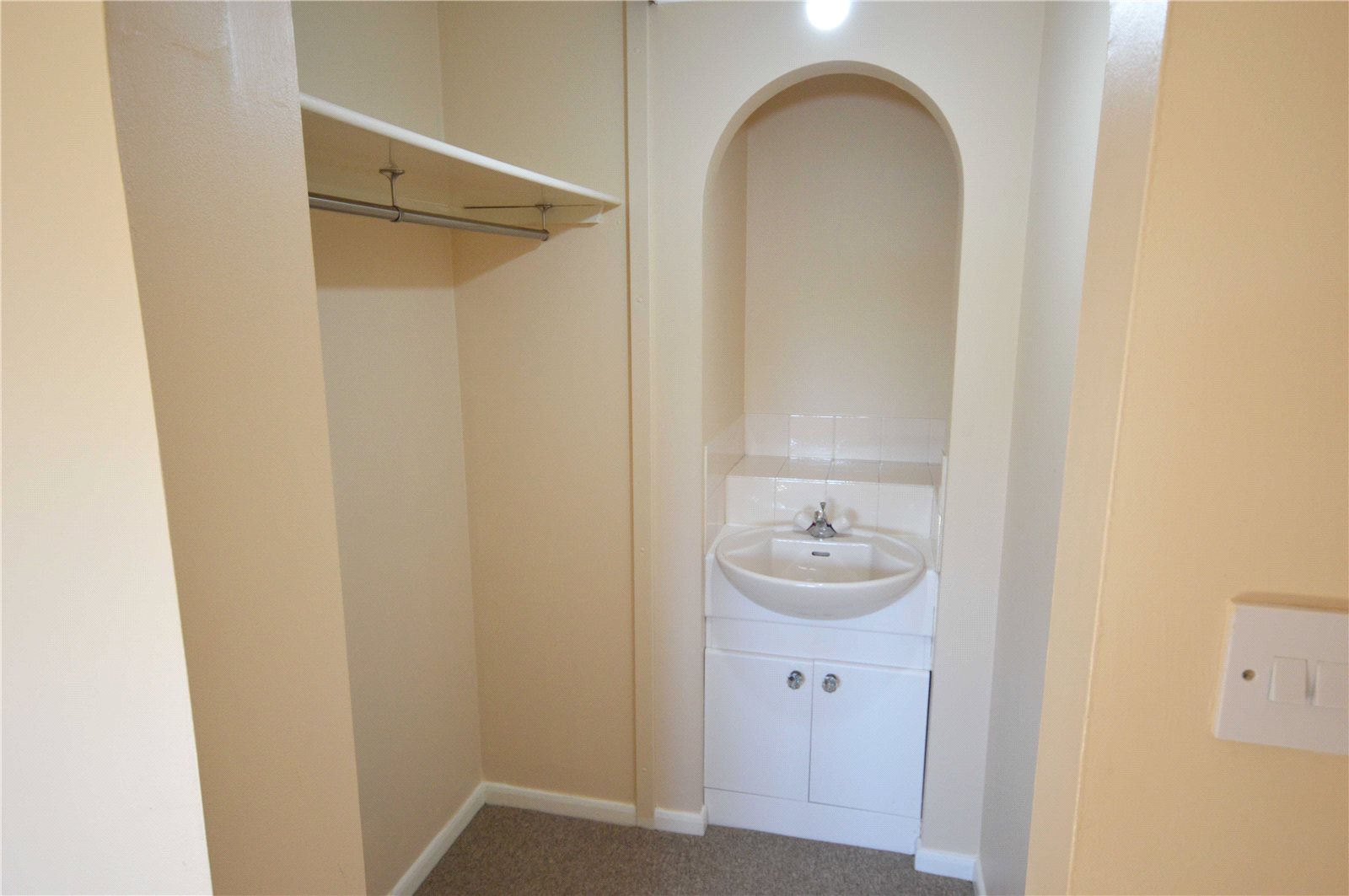 Entrance Hall Carpet. Night storage heater. Storage cupboard.