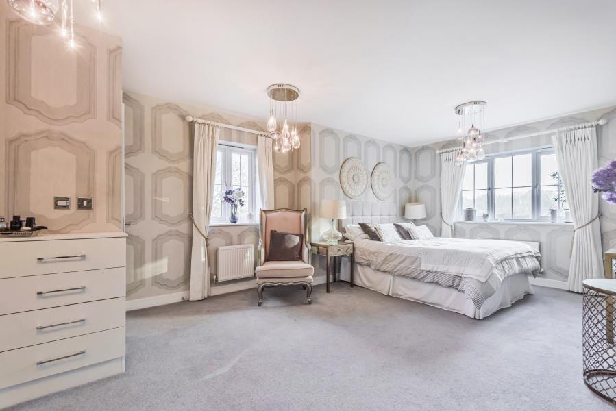 Unfurnished. A truly immaculate 5 bedroom house set in the heart of Ash Green. The property is the ex show home set in a small development within minutes from Ash Green train station. The property is accessed through the front garden and opens into a large and bright entrance hall. There is a large triple aspect master reception/dining room with feature fireplace. The large kitchen has a central island with high end integrated appliances and extends to a large conservatory overlooking the large rear garden. There is a further reception room/fifth bedroom with a downstairs cloakroom and storage cupboard. Upstairs comprises 4 double bedrooms with large master bedroom with ensuite. There is a separate and high end family bathroom. The garden overlooks fields and countryside and has a shed for storage and a wraparound front garden to the side. Ample driveway parking and excellent links into London, Guildford, Woking and Farnham. EPC rating B