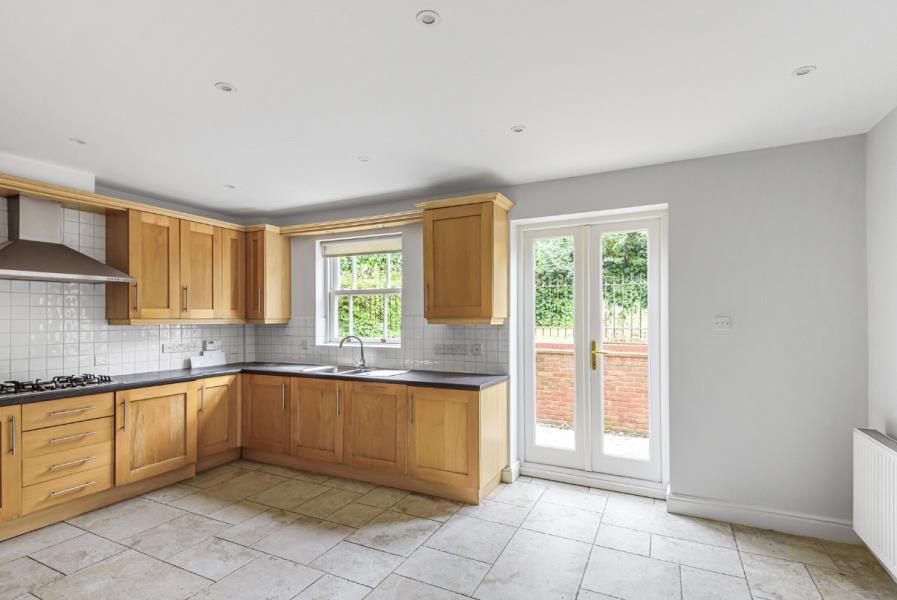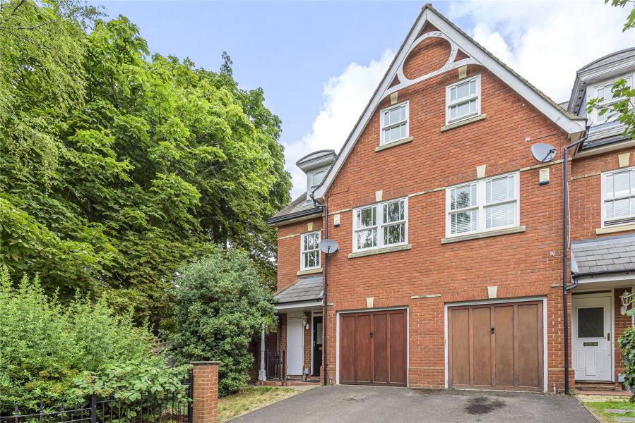 A light and spacious three storey 4 bedroom Town House with 3 bedrooms set in a quiet and prestigious location on the edge of Guildford Town Centre. The ground floor comprises a spacious kitchen/dining room with french doors leading onto the rear garden. The kitchen has high end integrated white goods. Separate utility room and downstairs cloakroom and access into the integral garage. The first floor has a large and light living room and the master bedroom with ensuite. The second floor has a bedroom with ensuite and a 2 further bedrooms with a family bathroom. Private rear garden, garage and driveway parking. Minutes to Town centre and mainline station. NEW CARPETS FITTED. EPC D