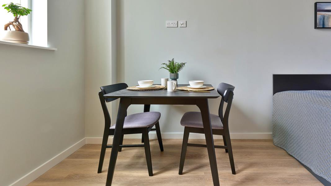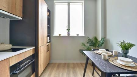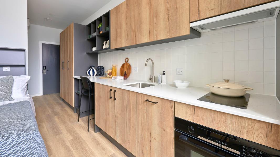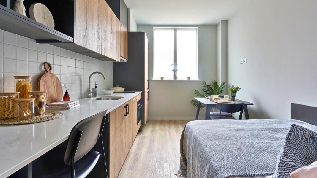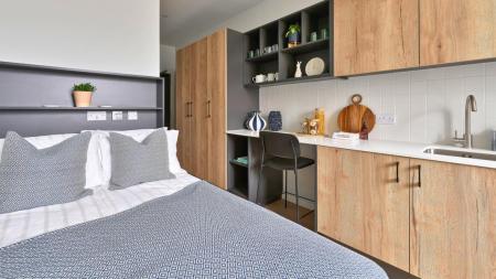 Inside your studio you'll find a cosy double bed, custom storage, a sleek open-plan kitchen, and a beautifully designed...