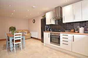 KITCHEN A modern Magnet fitted kitchen with a range of wall and base units, electric hob with extractor hood above and integrated oven below. Integrated dishwasher and washing machine. Fridge freezer available if required. Spacious dining area with tiled floor. Triple glazed window and door to rear.