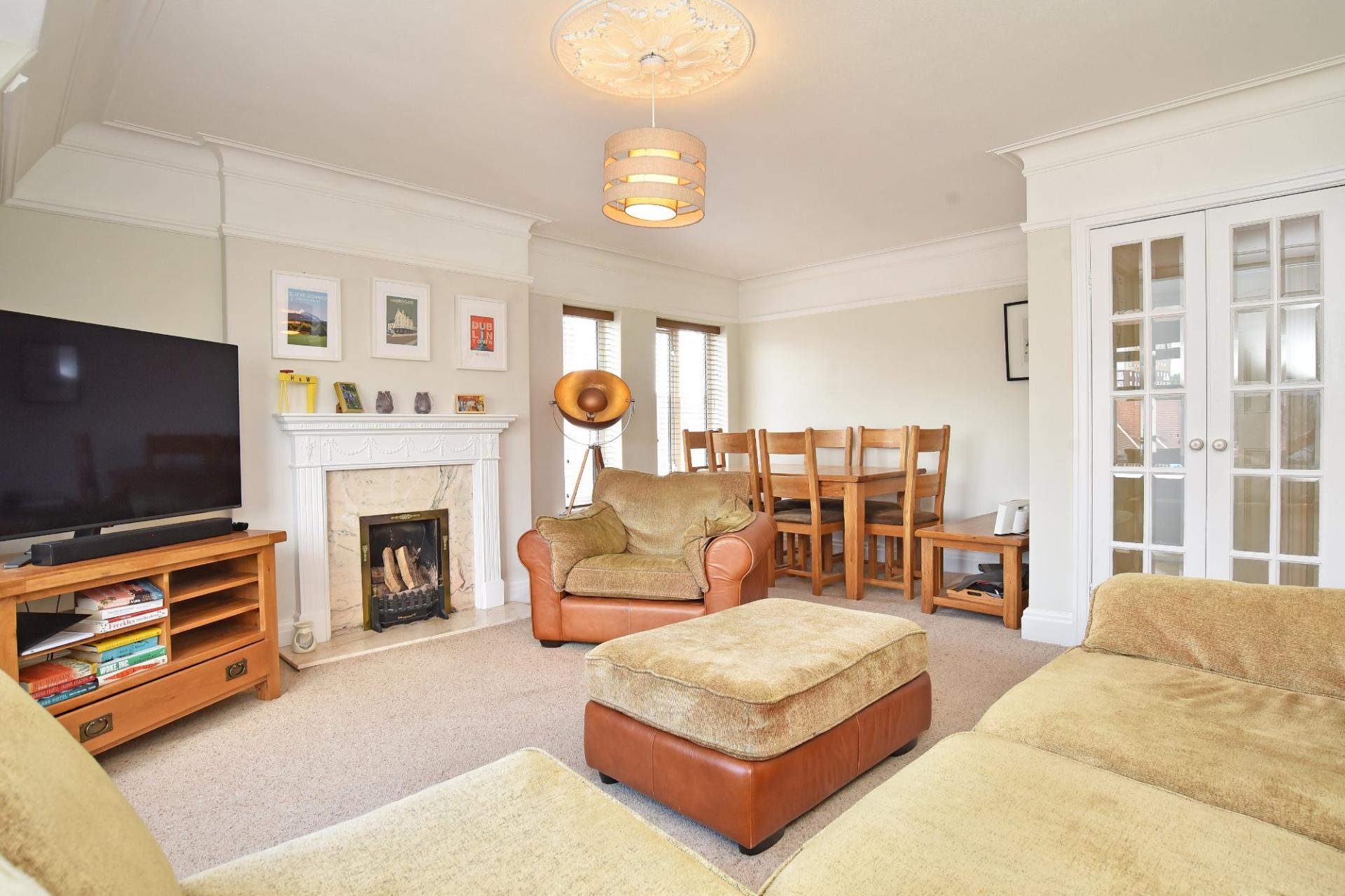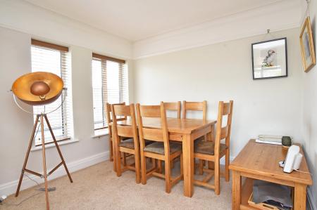 A spacious reception room with sitting and dining areas. Attractive fireplace and windows to front and side.