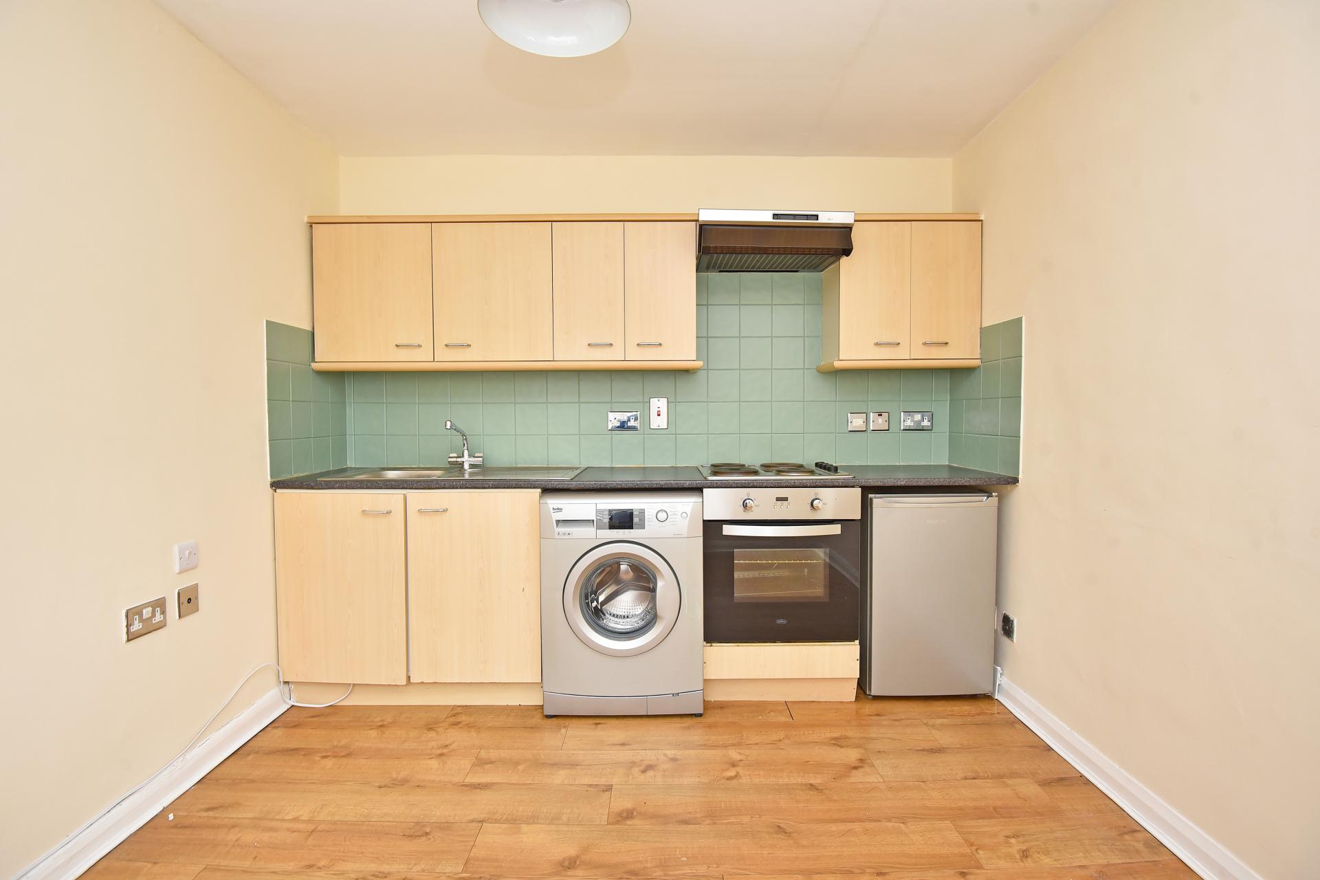 OPEN PLAN LIVING/KITCHEN 10' 11" x 11' 01" (3.33m x 3.38m) With modern kitchen comprising range of wall and base units and including electric oven/hob with extractor hood above, washing machine and fridge. With windows to two sides, laminate flooring and electric storage heater.