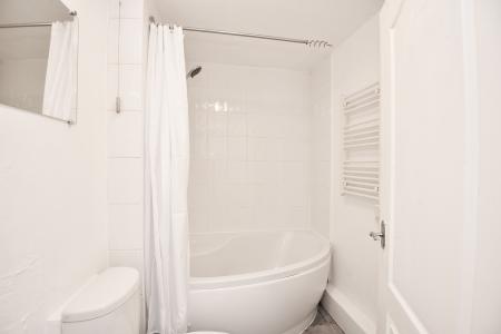 BATHROOM Fitted with a suite comprising low flush WC, pedestal wash hand basin, corner bath with shower above and heated towel rail.