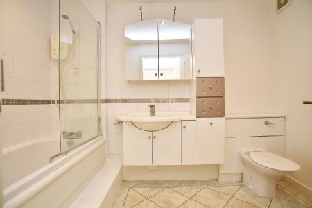 BATHROOM Fitted with a modern white suite comprising bath with shower over, wash hand basin and low flush WC. With useful built in storage unit and mirrored cabinet.