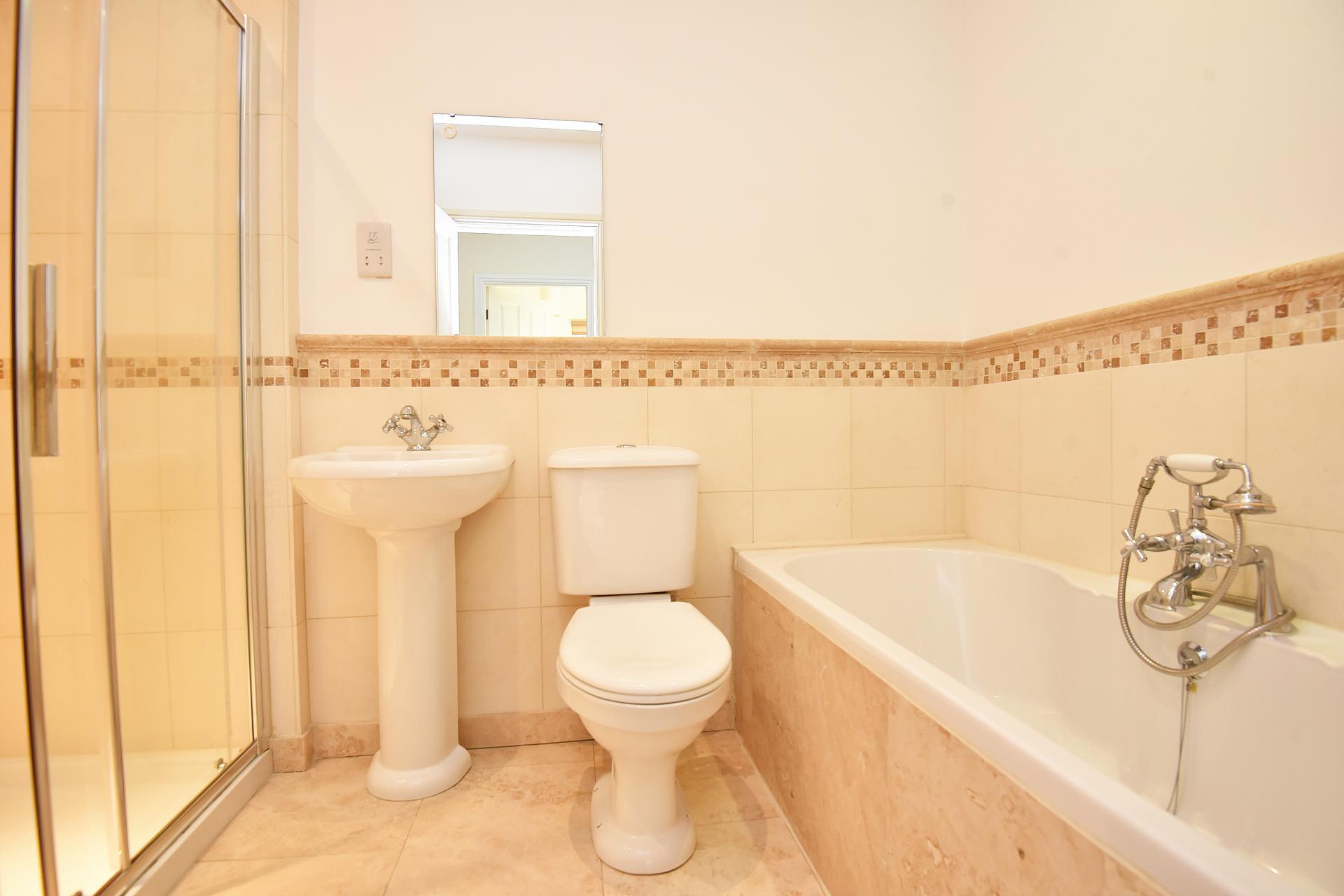 HOUSE BATHROOM Fitted with a modern white suite comprising low flush WC, wash hand basin, large bath with telephone style shower attachment and seperate walk-in shower cubicle.