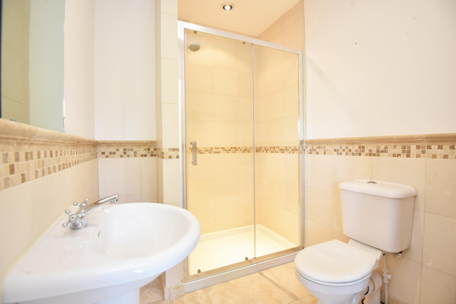 ENSUITE SHOWER ROOM Fitted with a modern white suite comprising low flush WC, wash hand basin and walk-in shower cubicle.