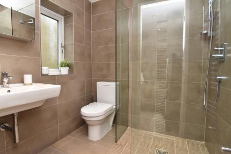 EN-SUITE SHOWER ROOM White suite comprising low-flush WC, washbasin and wet room area. Chrome heated towel rail, window and tiled floor.