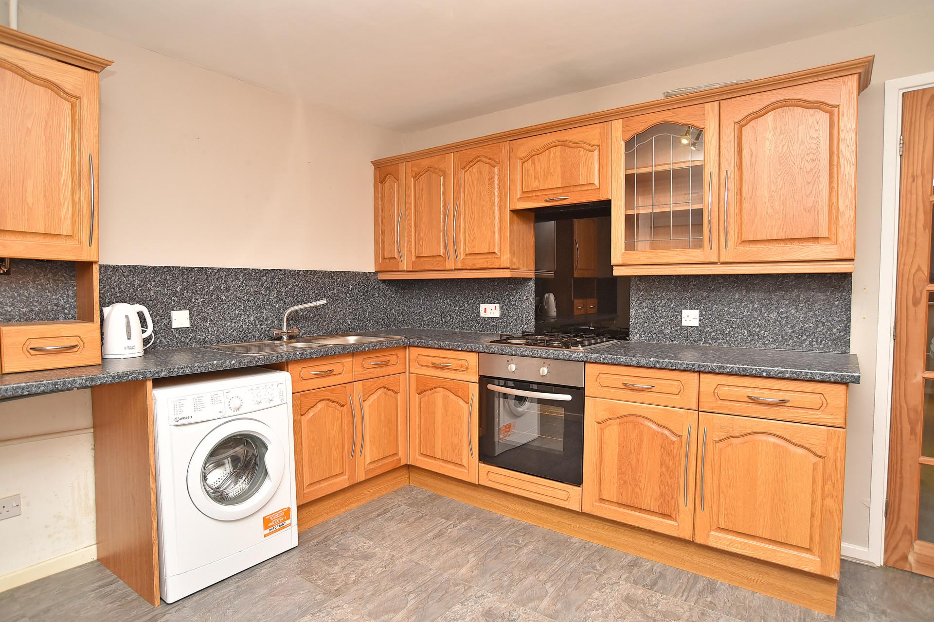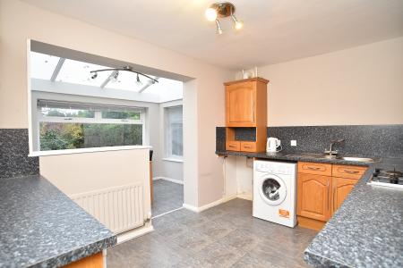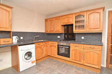 KITCHEN Fitted with a range of modern units with gas hob, integrated oven, washing machine, under counter fridge and freezer. Window to the rear.