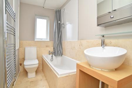 BATHROOM A well-appointed white suite comprising WC, basin and bath with shower above.