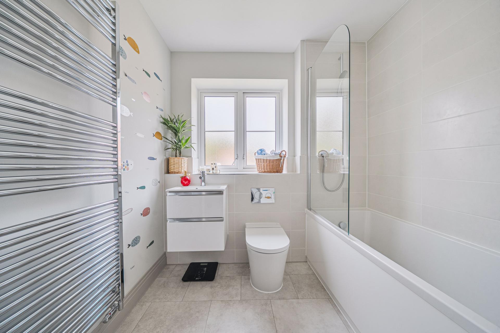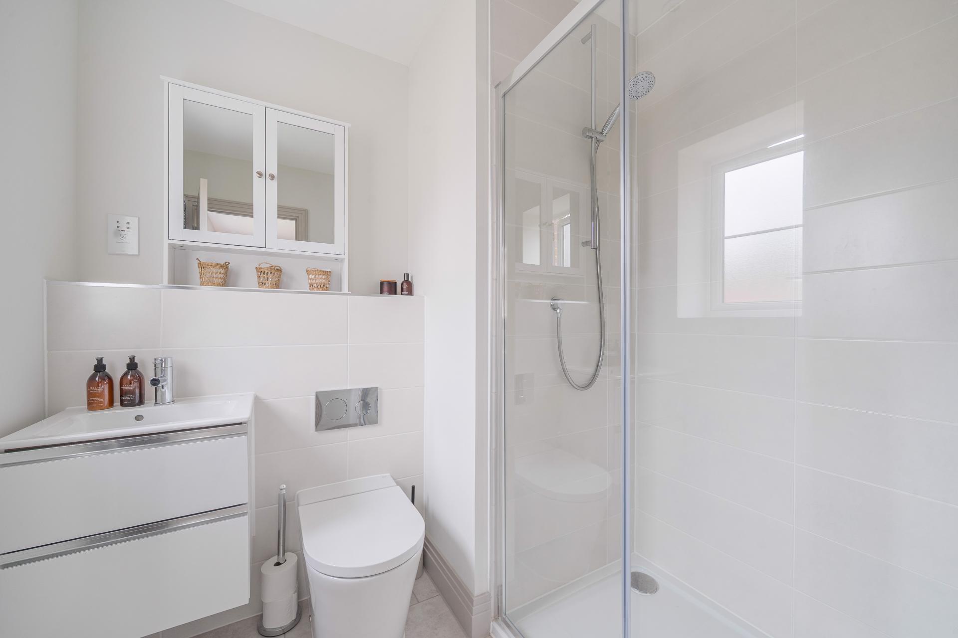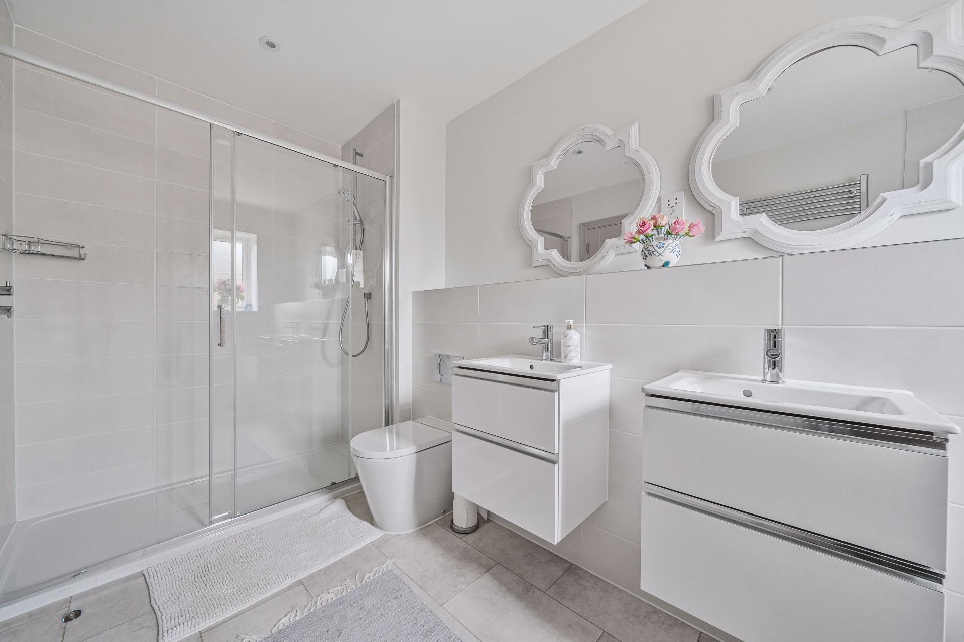 Upstairs, the first floor boasts three double bedrooms, two of which benefit from en-suite shower rooms, in addition to a stylish family bathroom.