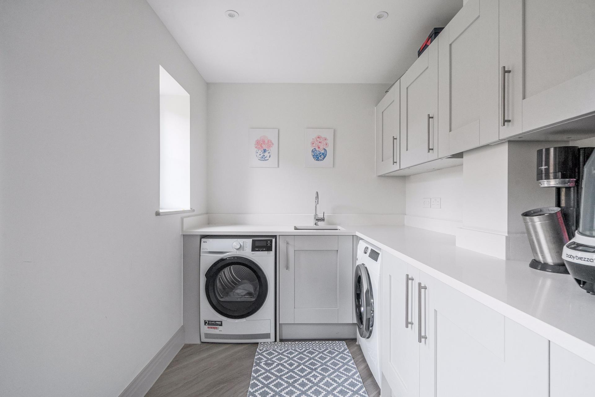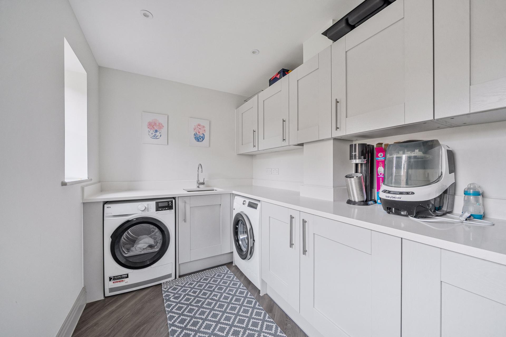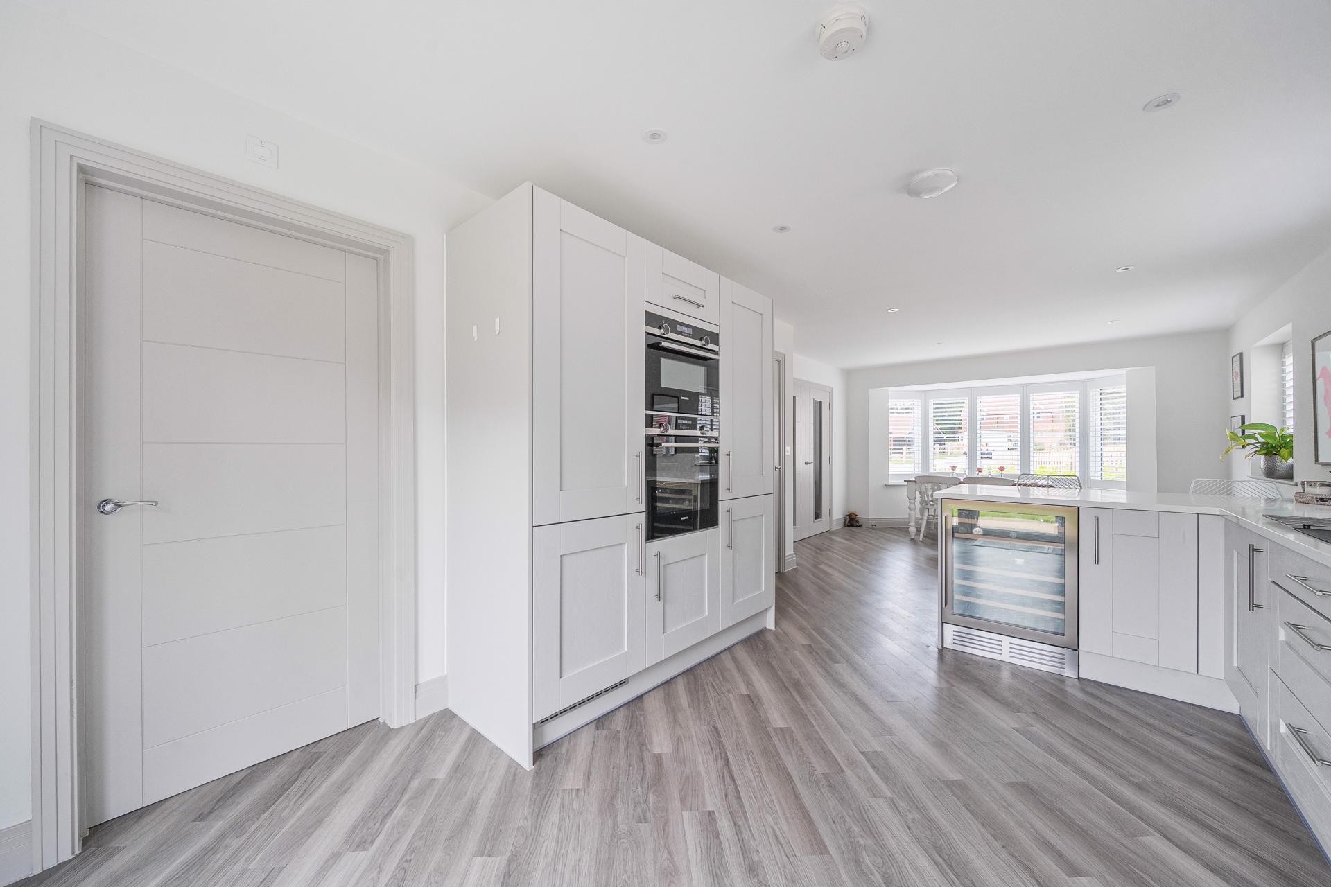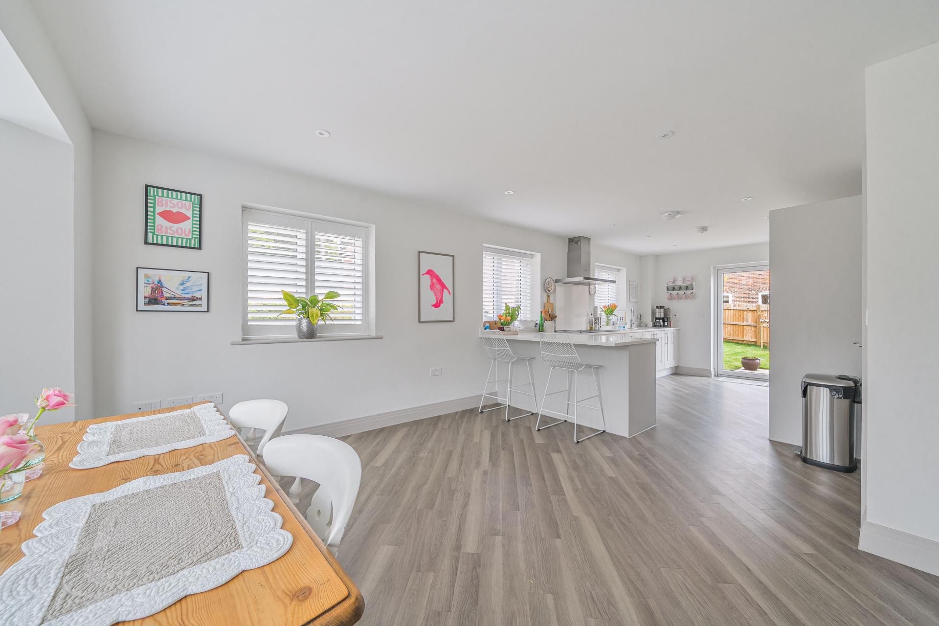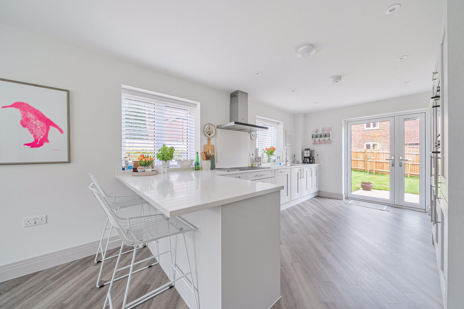 This spacious property welcomes you with a large entrance hallway leading through to a stunning open-plan kitchen and dining area, featuring a high-spec fitted kitchen complete with a Quooker tap and induction hob. The ground floor also offers a utility room, a separate study—ideal for home working—and a bright living room with French doors opening onto the generous rear garden.