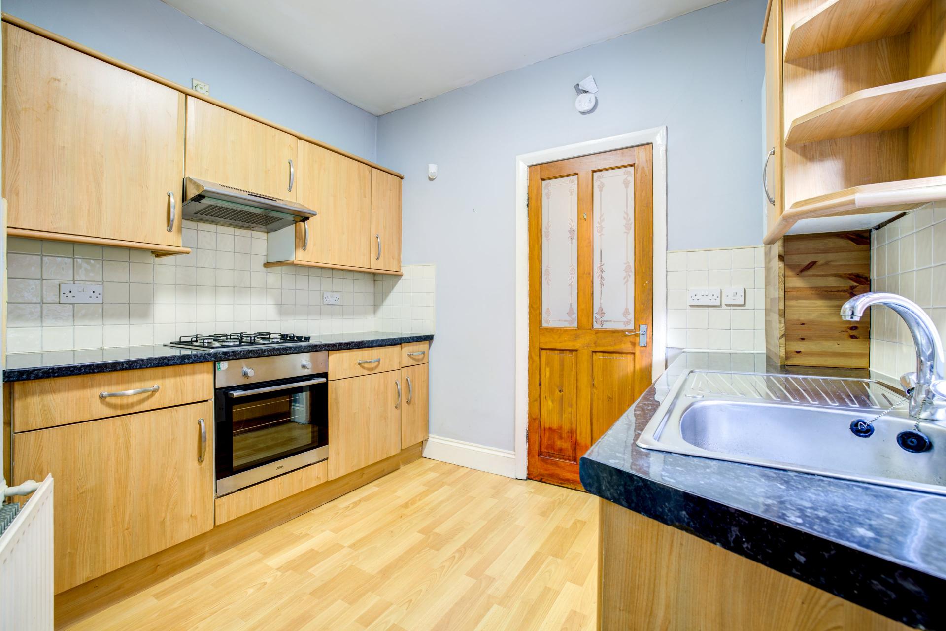 Wood effect wall and floor units, granite effect laminate worktop. Stainless steel sink with mixer tap & drainer. Integrated washing machine, electric oven, gas hob and overhead extractor fan. Wall mounted 'Main' boiler. Door leading bathroom & rear garden.