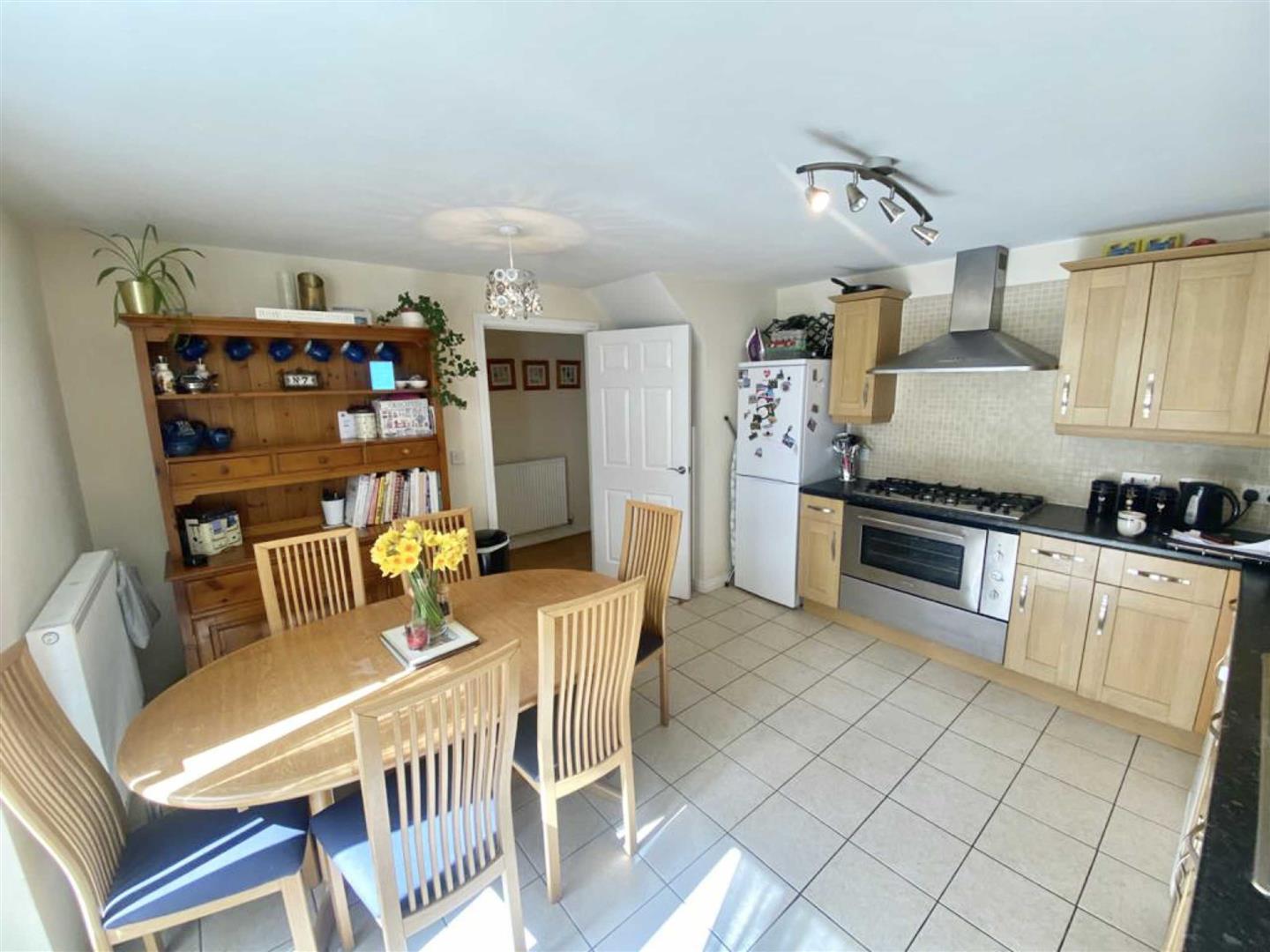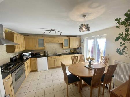 Kitchen/ Breakfast Room - 13'9'' x 13' - Fitted kitchen with oak effect wall and base units, granite effect work top surfaces, range cooker with a six ring gas hob, stainless steel cooker hood over, stainless steel single drainer sink unit with mixer tap, dishwasher, washing machine, fridge/ freezer, ceramic tiled floor, double glazed French doors to garden, mosaic style tiled walls, ceiling lights, built in understairs cupboard.